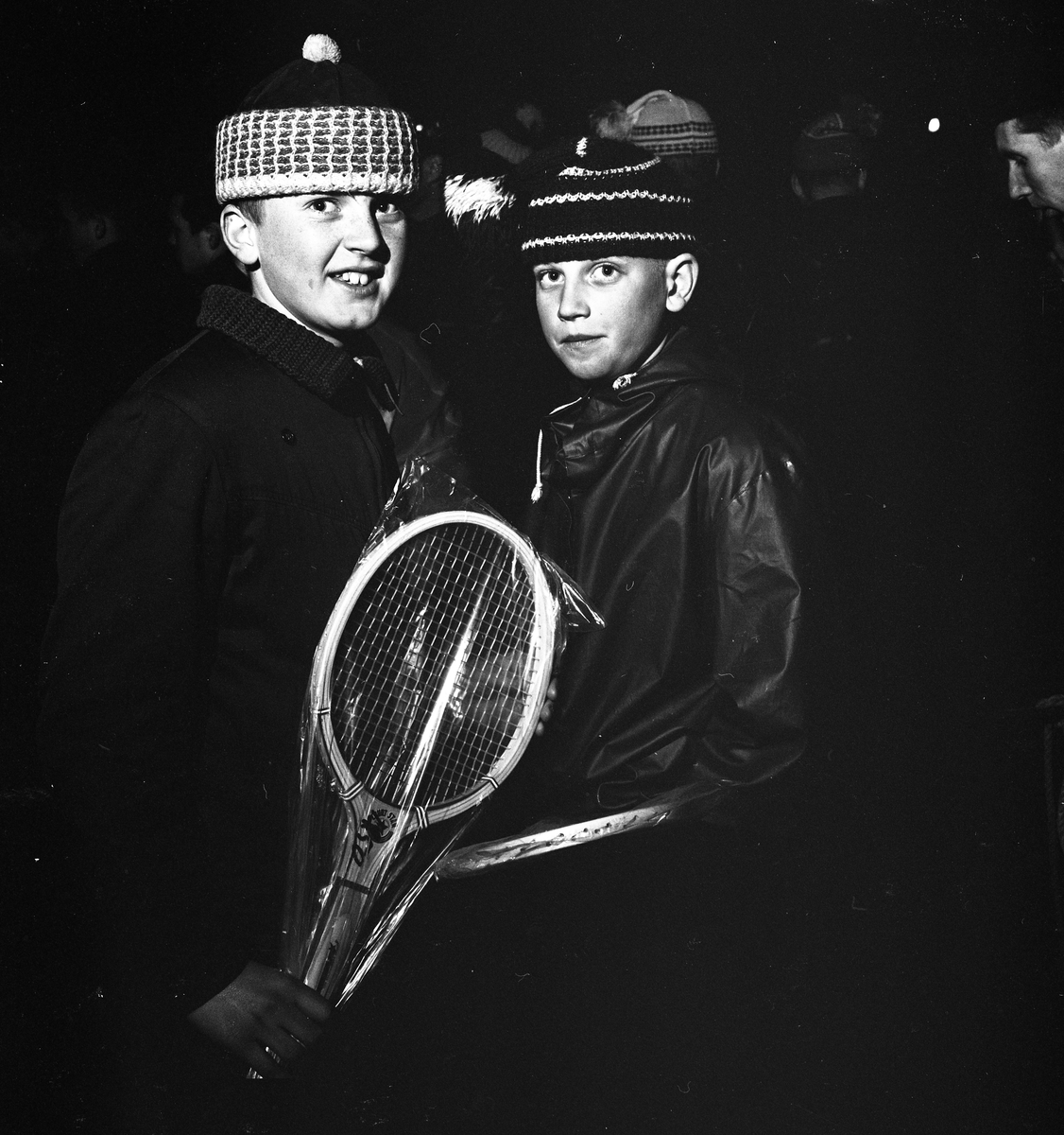 Arboganatta, orientering. Två pojkar, iklädda mössor och jackor, har vunnit var sitt badmintongracket.