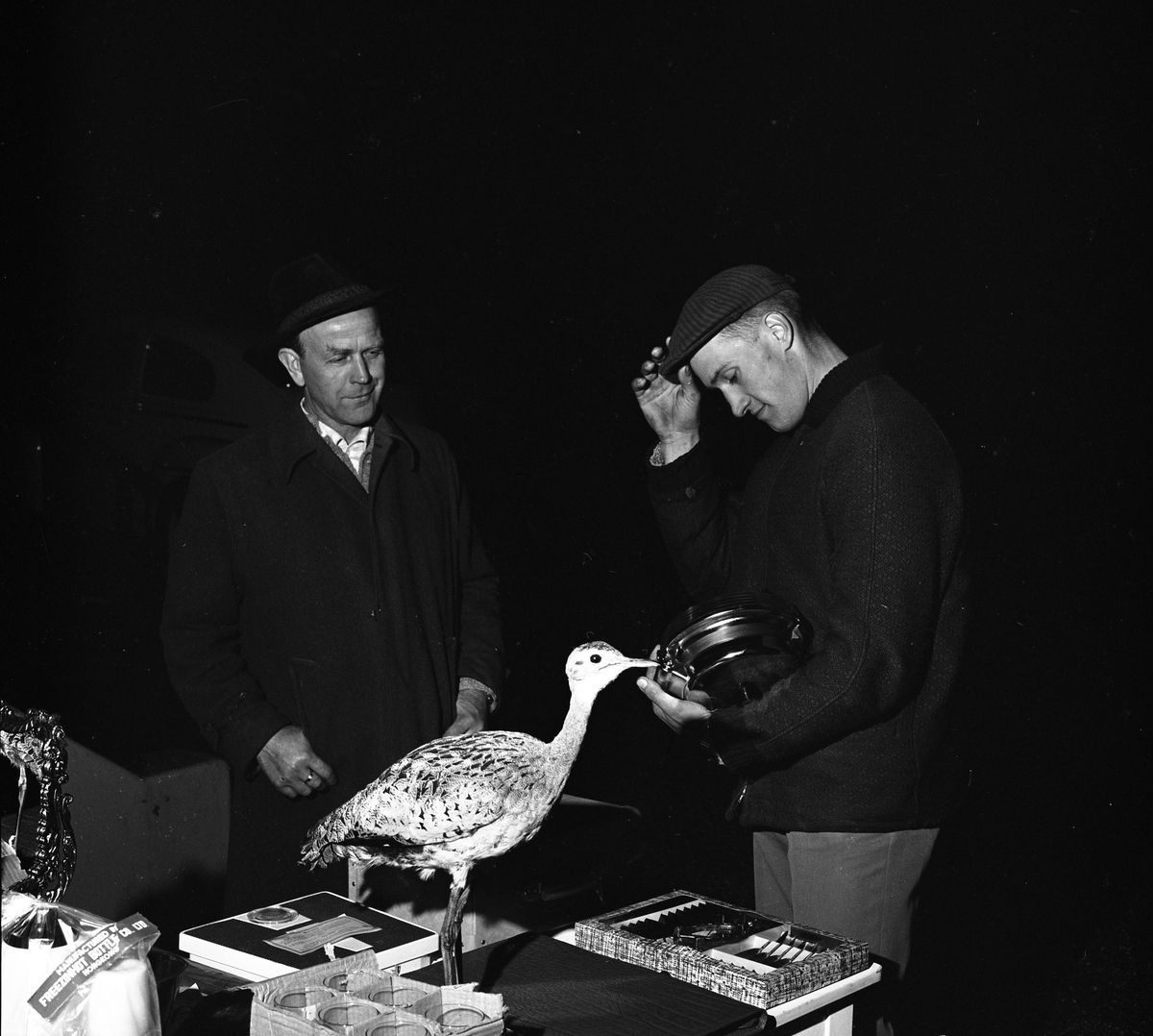 På prisbordet finns bland annat en badrumsvåg, en uppsättning bestick, ett halvt dussin glas och en uppstoppad fågel.