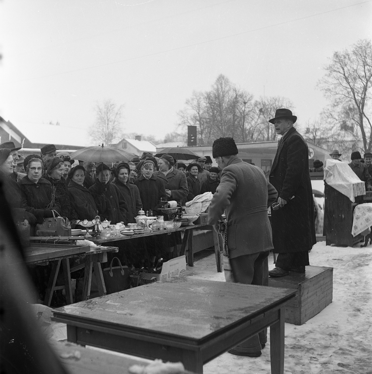 Auktion på Hamntorget, utomhus. Auktionsförrättaren står på en låda. Han har hatt och överrock på sig och klubban i handen. En man i krimmelmössa visar föremålen. På bordet framför dem står porslin och andra småsaker. Längst till höger står möbler, täckta mot väder och vind. Publiken består mest av kvinnor. Några har paraply. I bakgrunden syns Texacomacken.