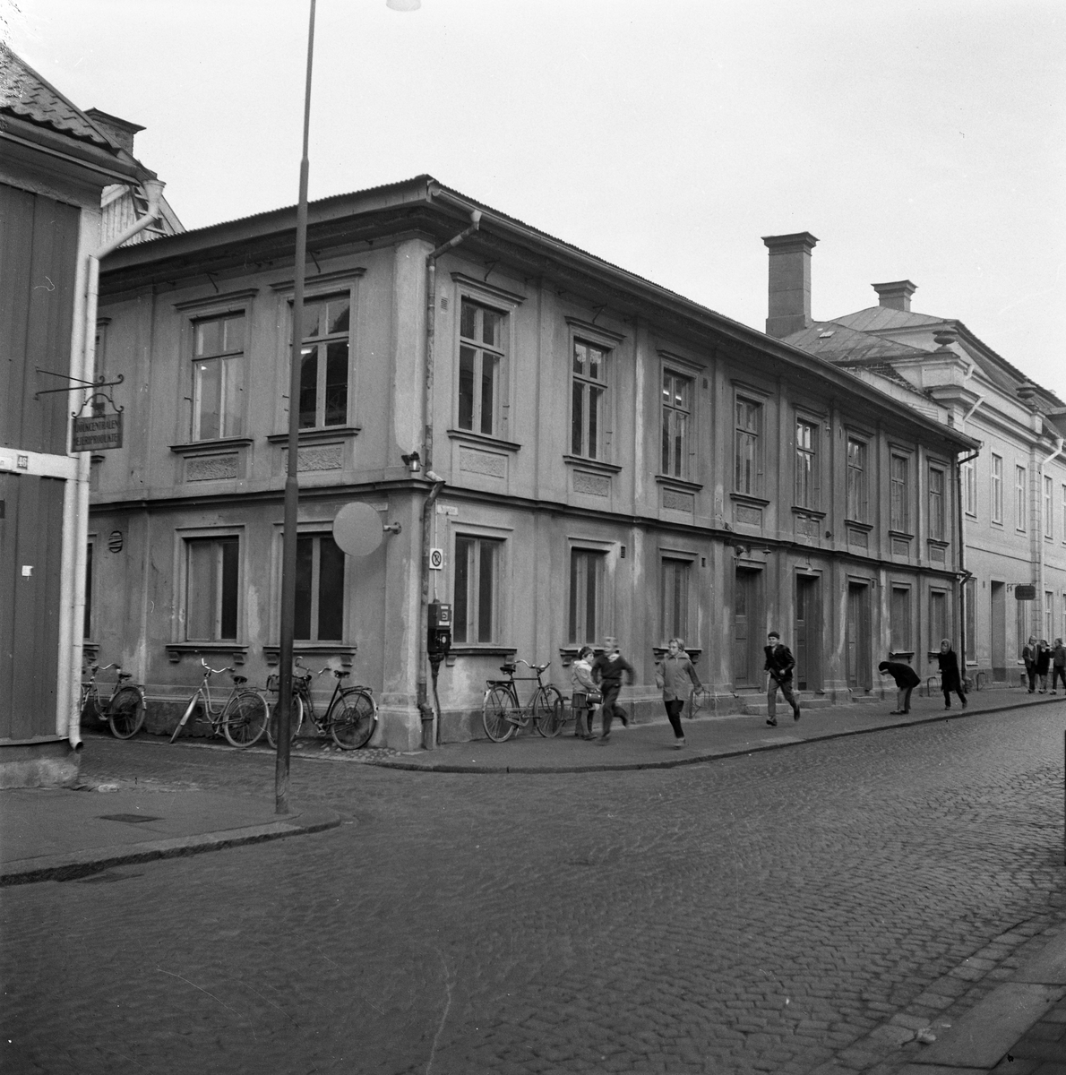 Biblioteket ligger i den här fastigheten på Nygatan. Huset är "Gamla Gästis". Skolbarn kommer springande på trottoaren. Flera cyklar är parkerade utanför biblioteket.