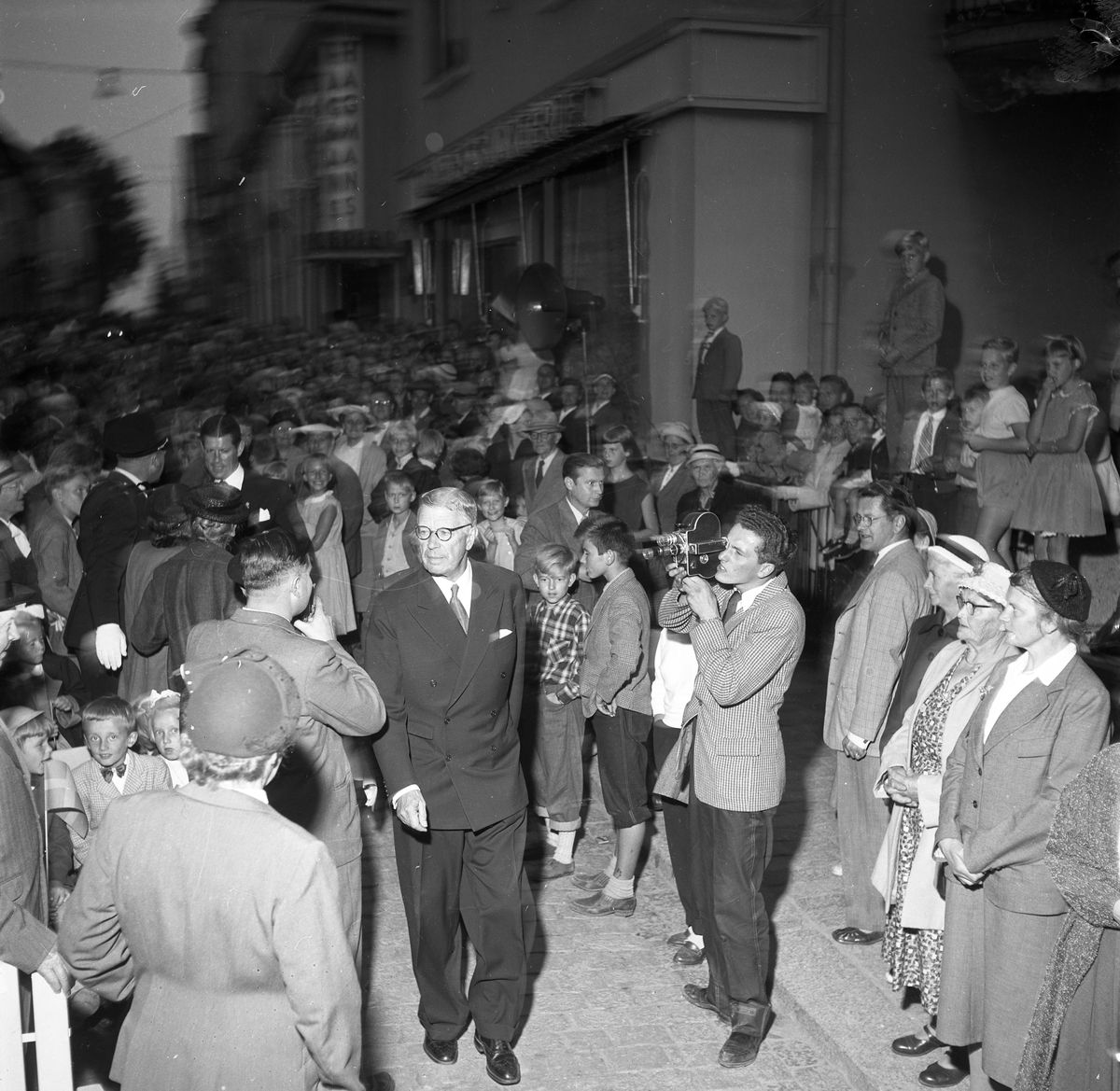 Konung Gustaf Vl Adolf gästar Arboga under sin Eriksgata. Här ses kungen i folkhavet på Stora torget med Rådhusgården till höger. Han har just passerat Hagmans Livs och Andelsslakteriet. Mannen till höger om kungen, med filmkameran, är Larz-Thure Ljungdahl.