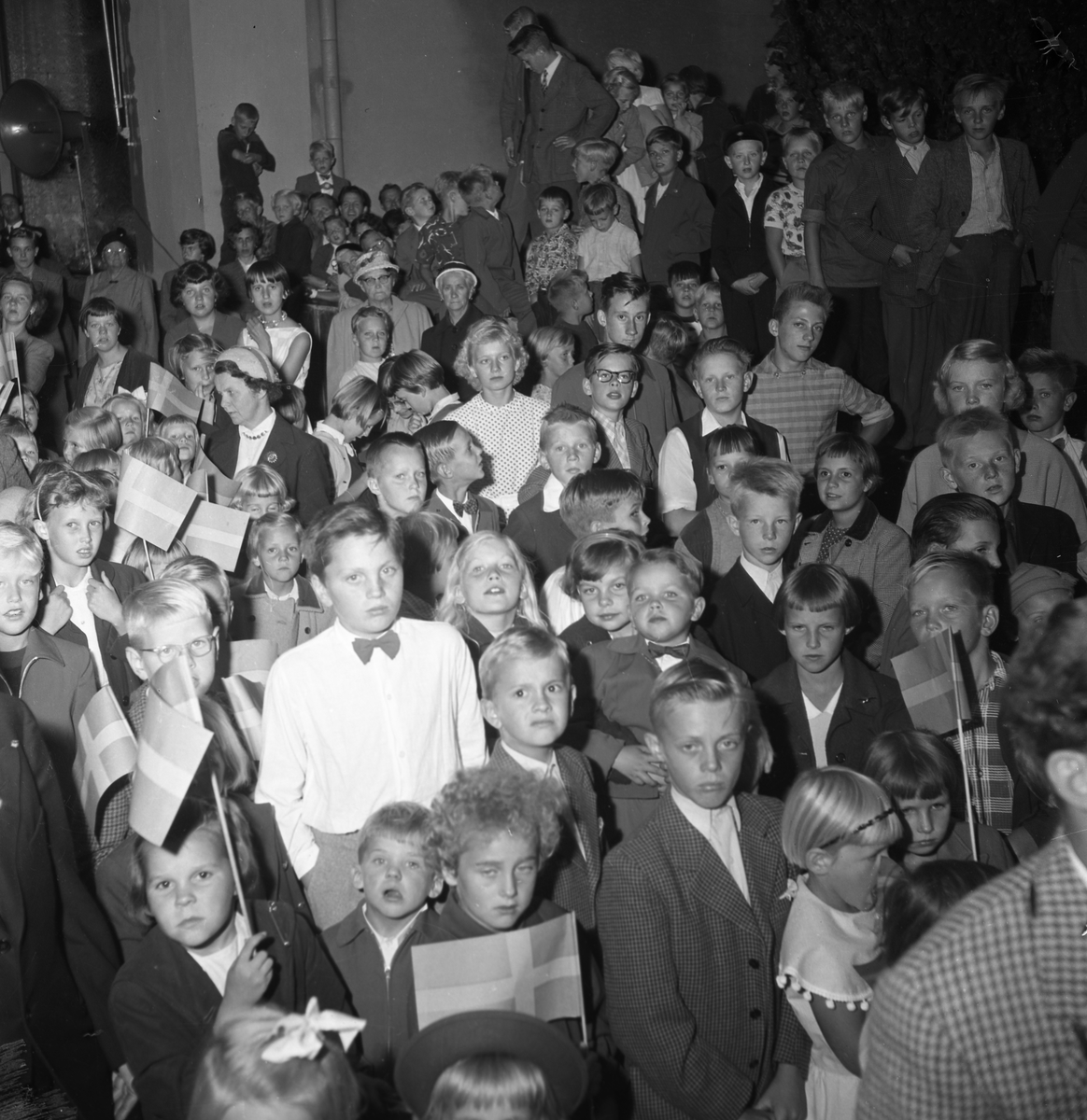 Publikbild av barn och ungdomar som samlats på Stora torget för att få en skymt att kung Gustaf Vl Adolf som är på Eriksgata i Arboga. 6000 personer har samlats för att lyssna på konungen.