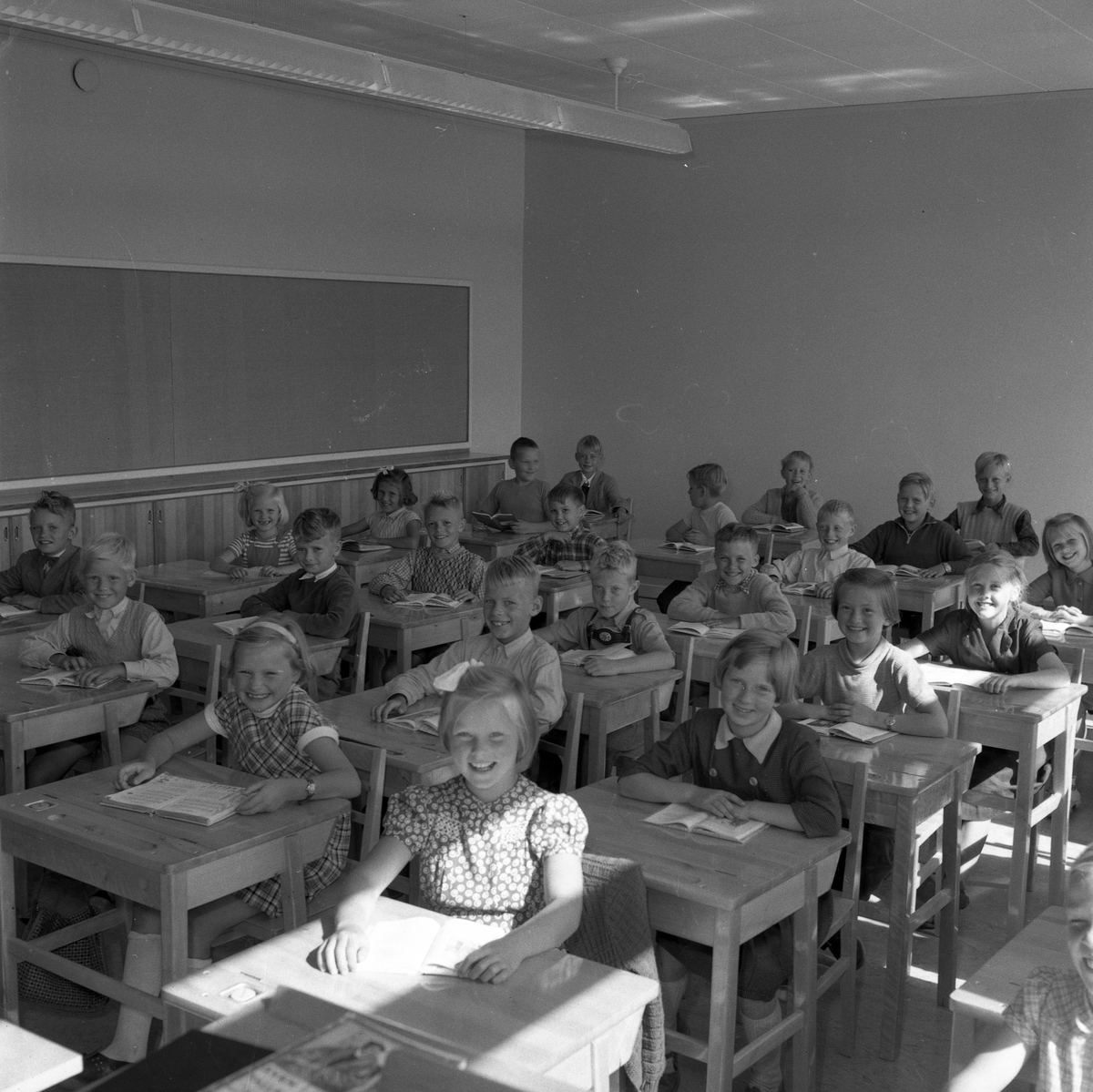 Gäddgårdsskolan har öppnats. Här sitter glada elever vid var sin bänk.