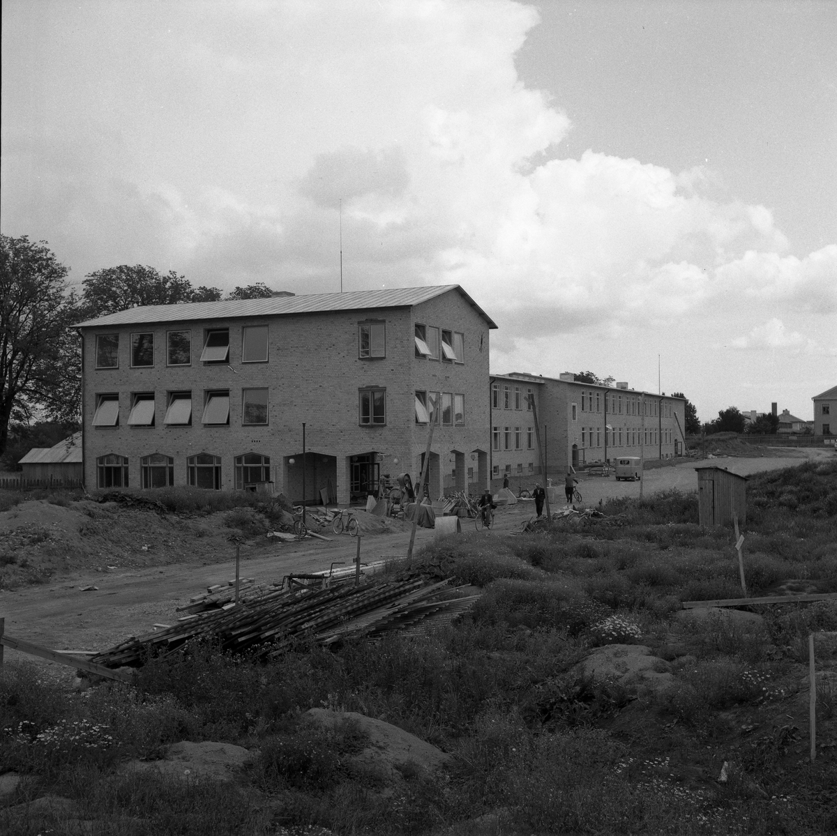 Gäddgårdsskolan börjar bli färdig att tas i bruk. Fönstren är öppna för vädring. Det ligger virke på gården, en cementblandare står kvar. Män cyklar. En bil står parkerad utanför huset.