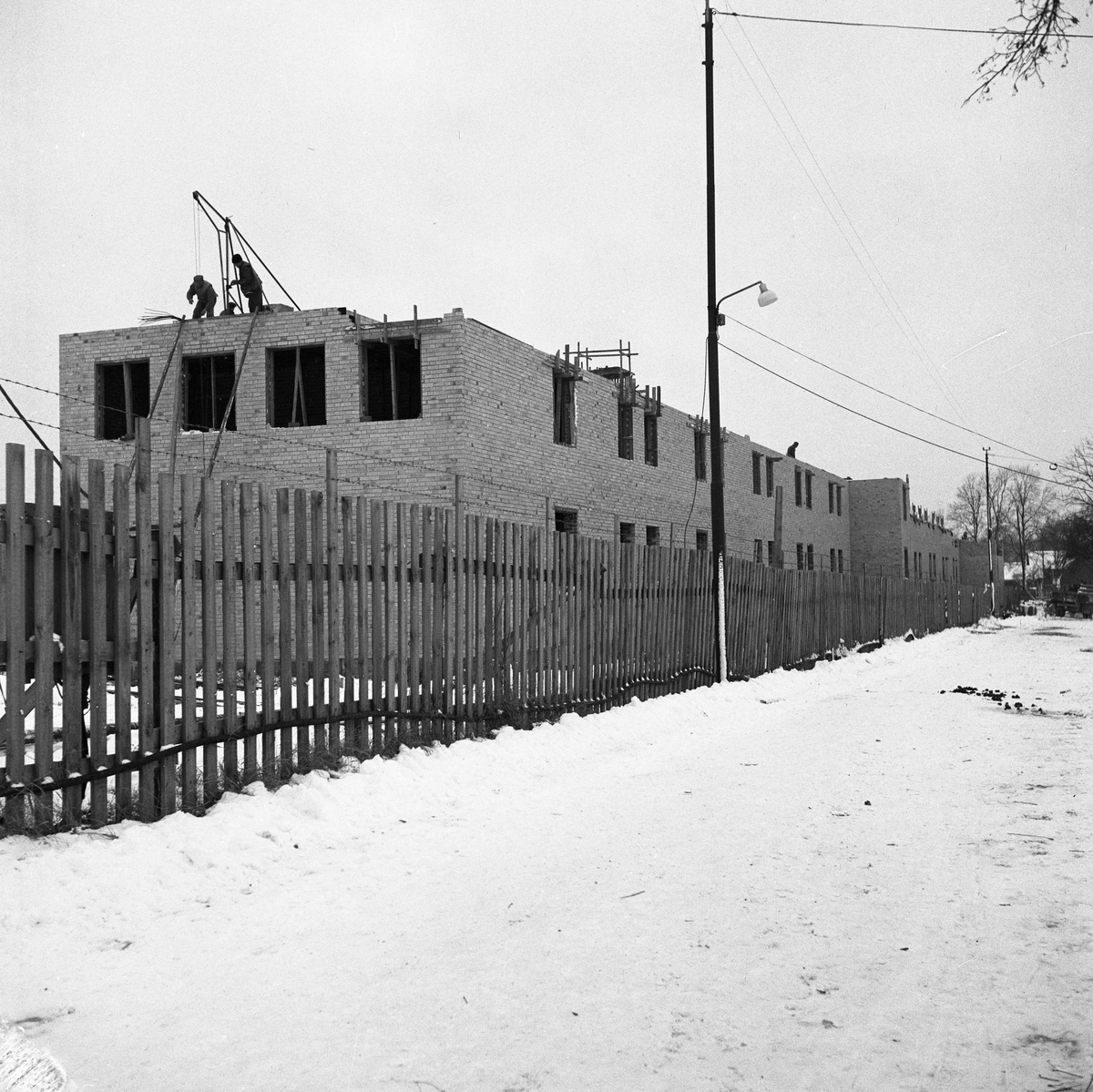 Gäddgårdsskolan byggs. Två män murar tegel på huvudbyggnaden.