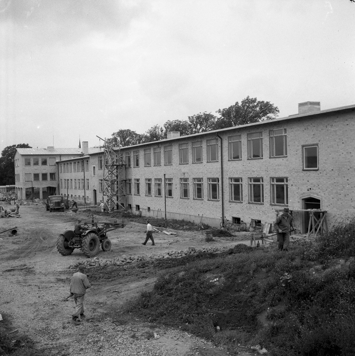 Gäddgårdsskolan byggs. Marken, framför byggnaden, är inte färdigställd. Flera män är i arbete. En byggnadsställning står rest mot husväggen. En lastbil och en traktor används i arbetet. Långt bort, till vänster, står en cementblandare. Till höger går en man med en lie.