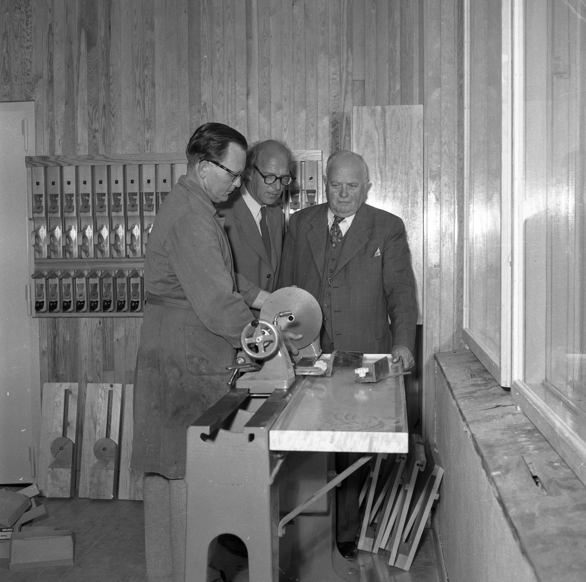 Här är slöjdlärare Erik Karlsson, som visar en av maskinerna för en okänd man och skolans rektor, Georg Rudhner (längst till höger)
