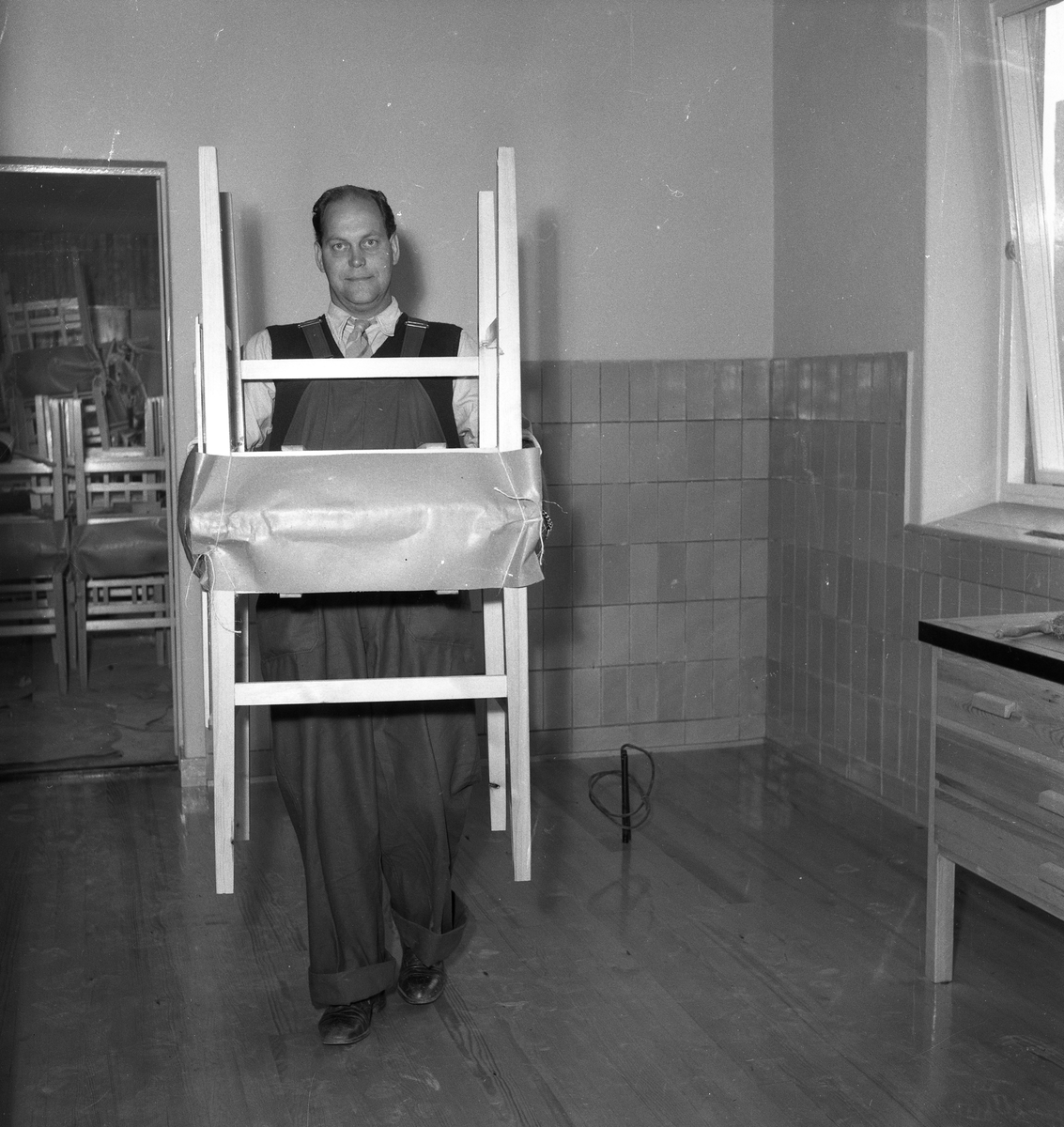 Inflyttning i Gäddgårdsskolan. Vaktmästaren bär stolar.