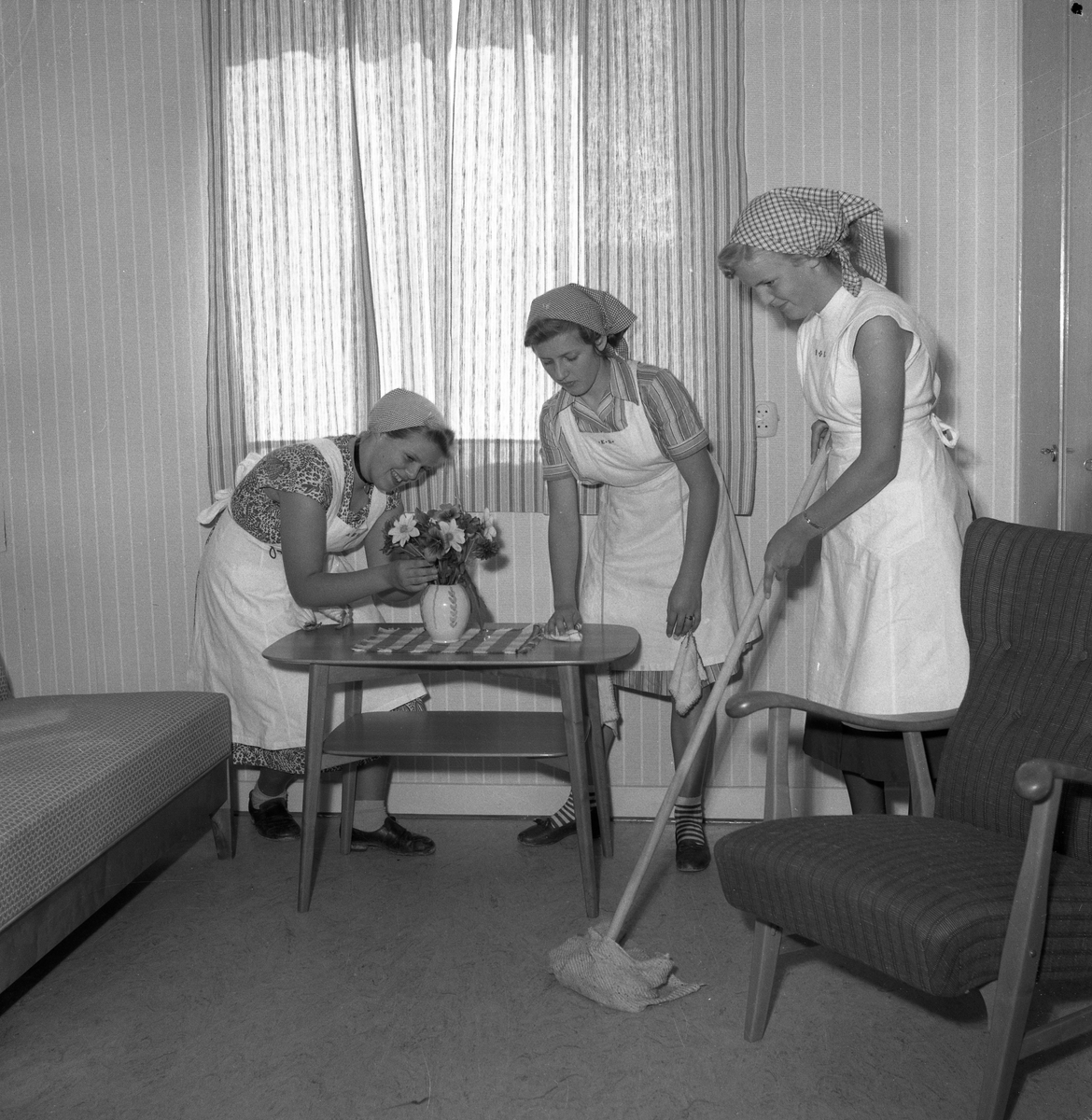 Hemkunskapsundervisning på Gäddgårdsskolan. Anita Bengtsson ordnar med blommorna, Sonja Berglind torkar bordet och en okänd flicka skurar golvet. Alla tre är klädda i sjaletter och förkläden.