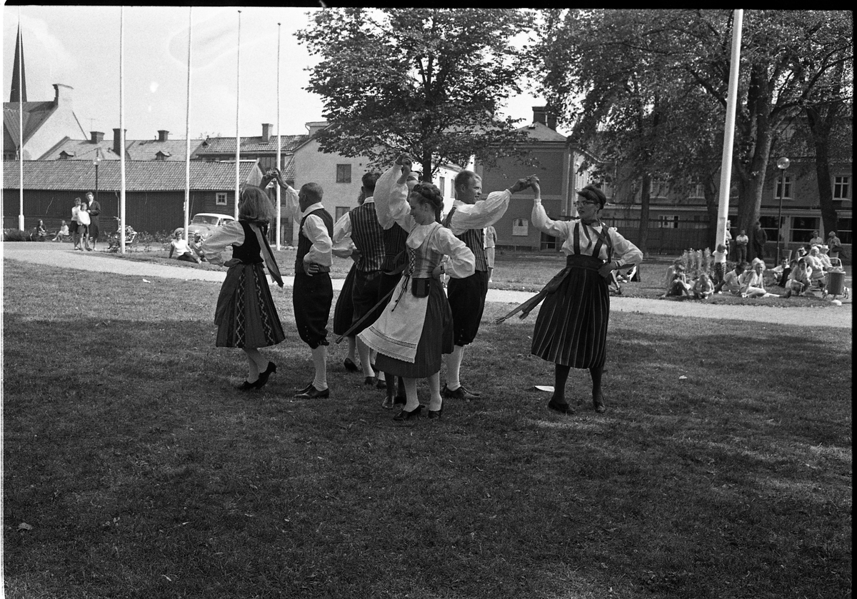 Dansuppvisning av gäster från vänorten Hallola. De bär folkdräkt. Publiken sitter i gräset.