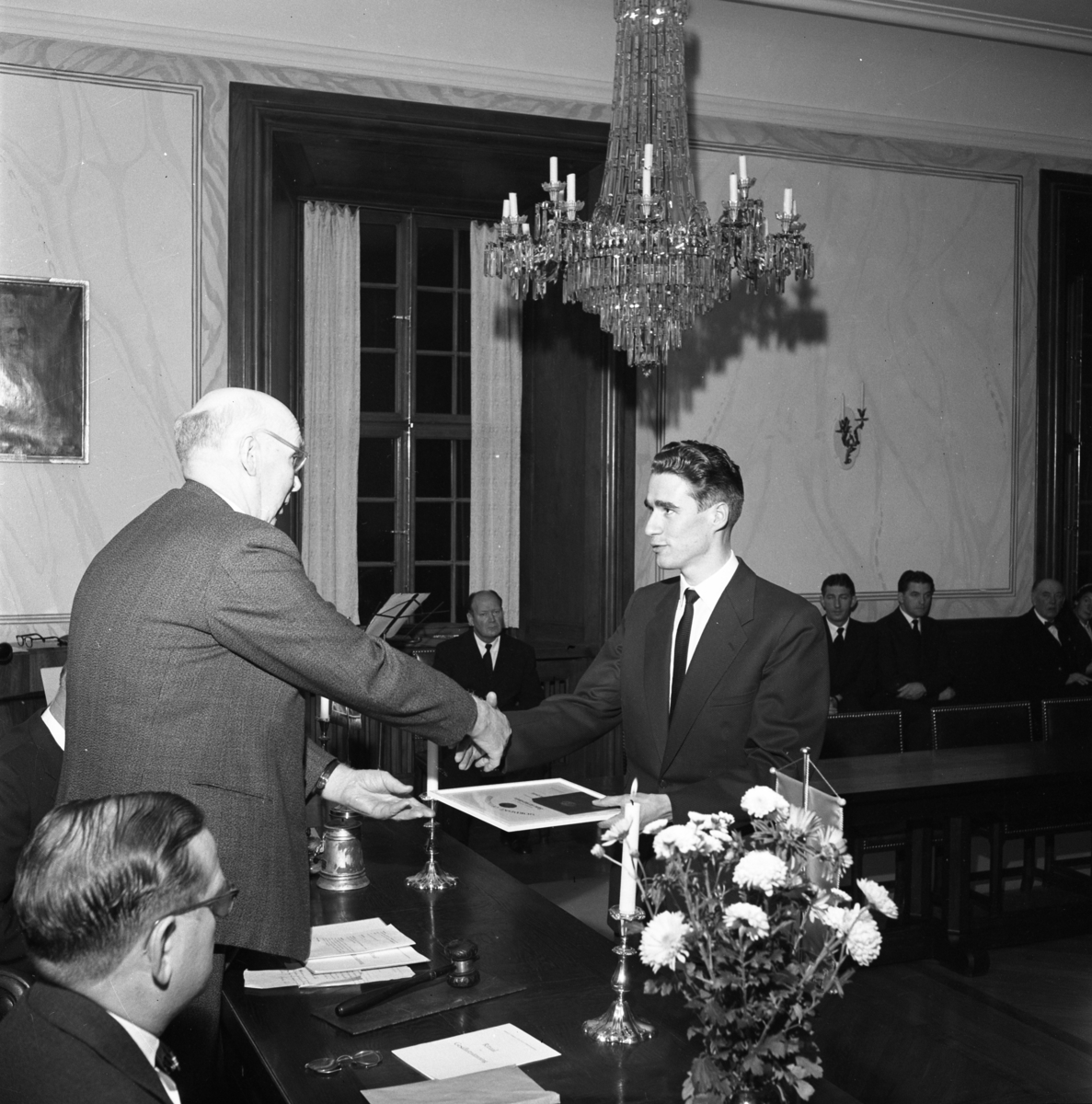 Hantverksföreningens ordförande, Gustaf Johansson (Murar-Gustaf), delar ut mästarbrev i teoretisk och praktisk optik till Sune Gerhardsson.