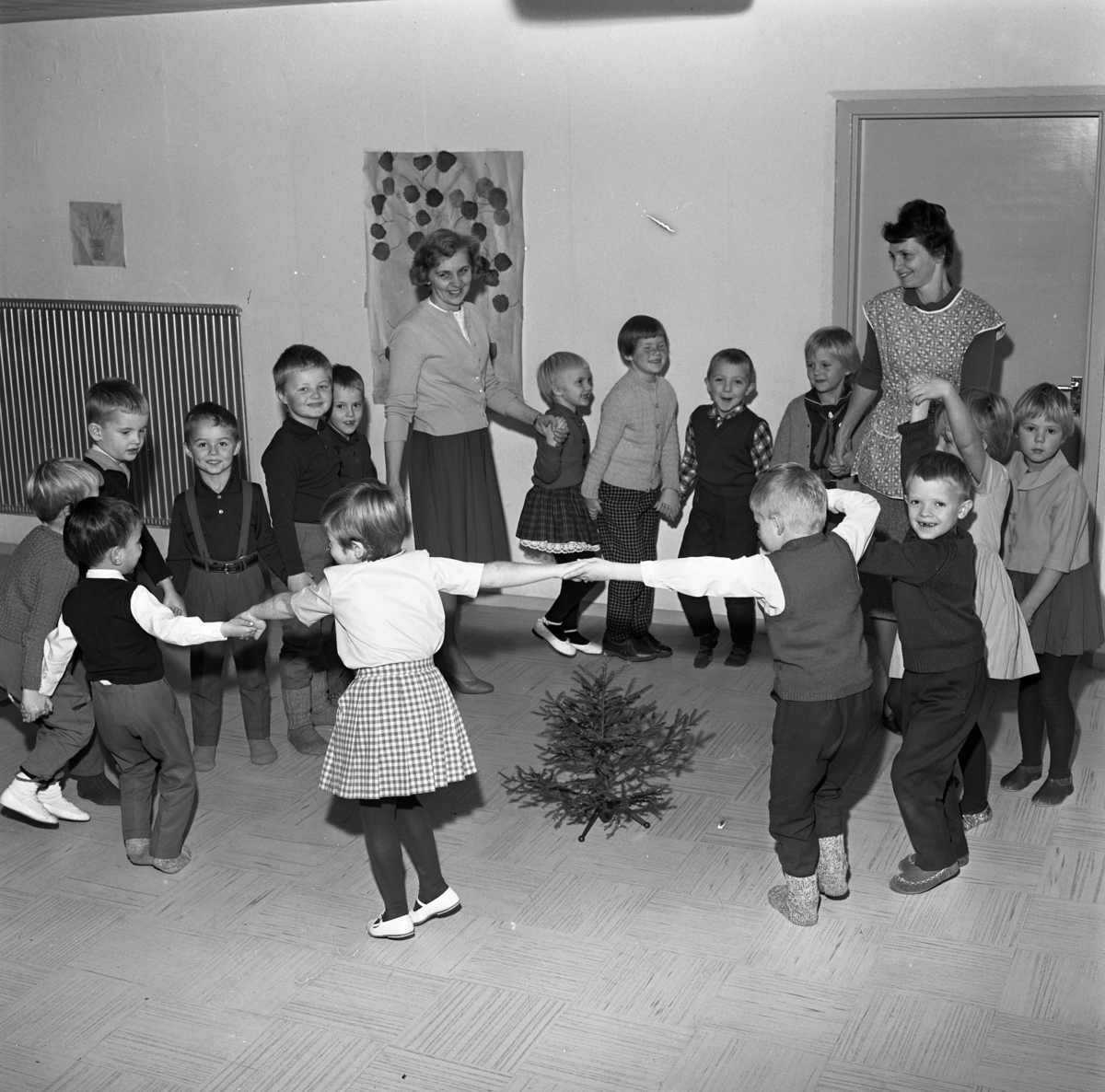 HSB´s barnträdgård. Två fröknar och alla barnen dansar runt en liten gran.