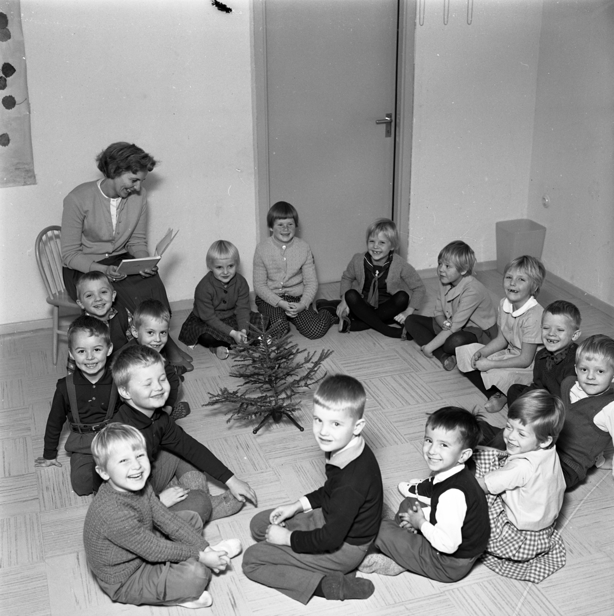 HSB´s barnträdgård. Sagostund. Fröken läser ur en bok och barnen sitter i ring på golvet. Mitt i ringen står en liten julgran.