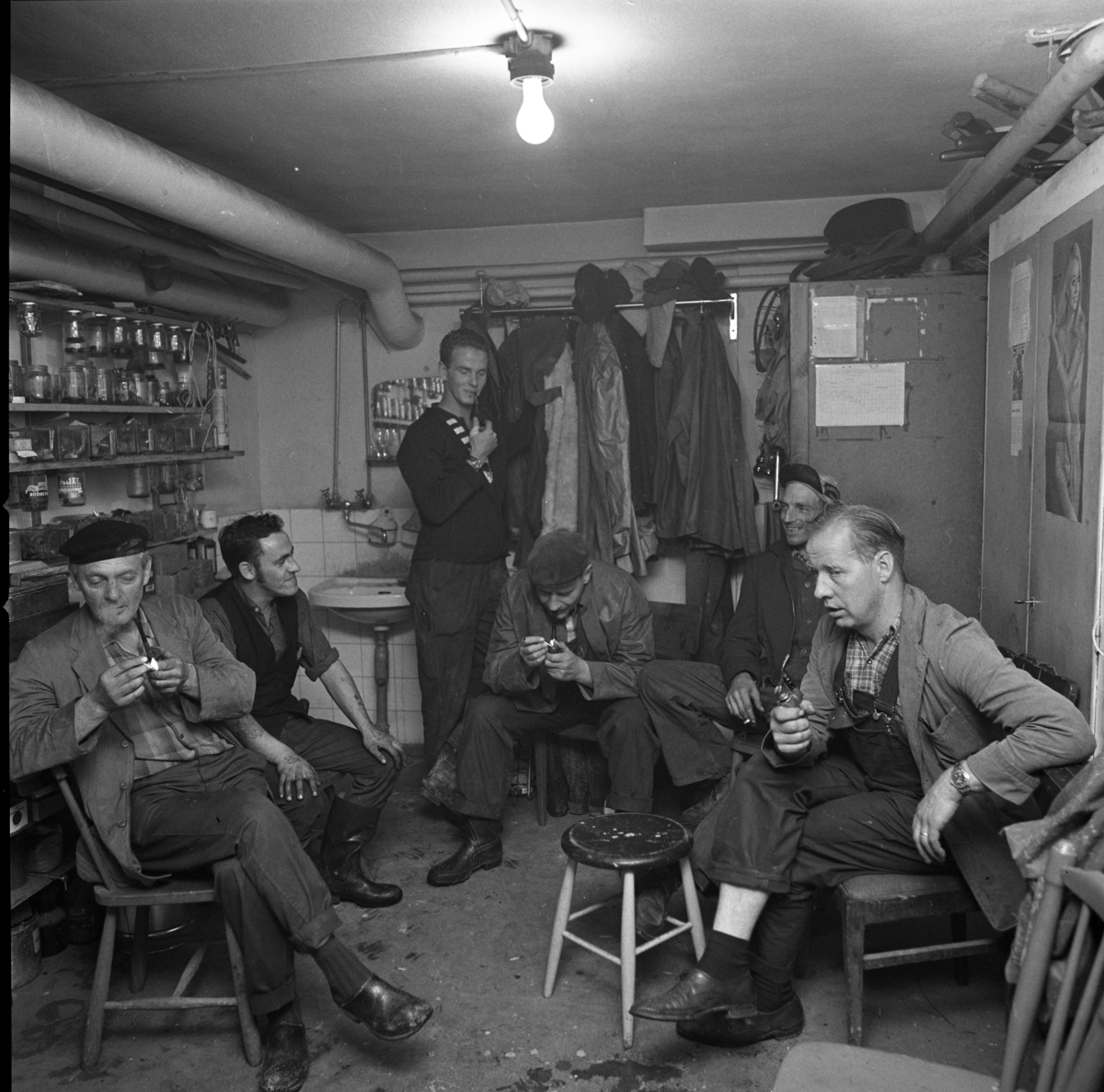 Sex män har rast i källarlokalen. Fyra röker pipa, en cigarett och är passiv rökare. De har arbetskläder på sig, skyddsrockar och blåkläder. Efter ena väggen har de glasburkar med skruvar och andra småprylar i. En hatthylla är full av jackor och mössor. I hörnet finns ett handfat. En naken glödlampa lyser i taket.