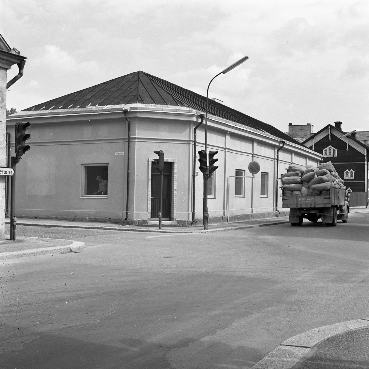 Korsningen Hamngatan - Herrgårdsgatan. Huset renoveras på insidan, en hantverkare syns i fönstret. På Östra Hamngatan kör en lastbil från Albin Rapps Konfektionsfabrik. Den är lastad med säckar.