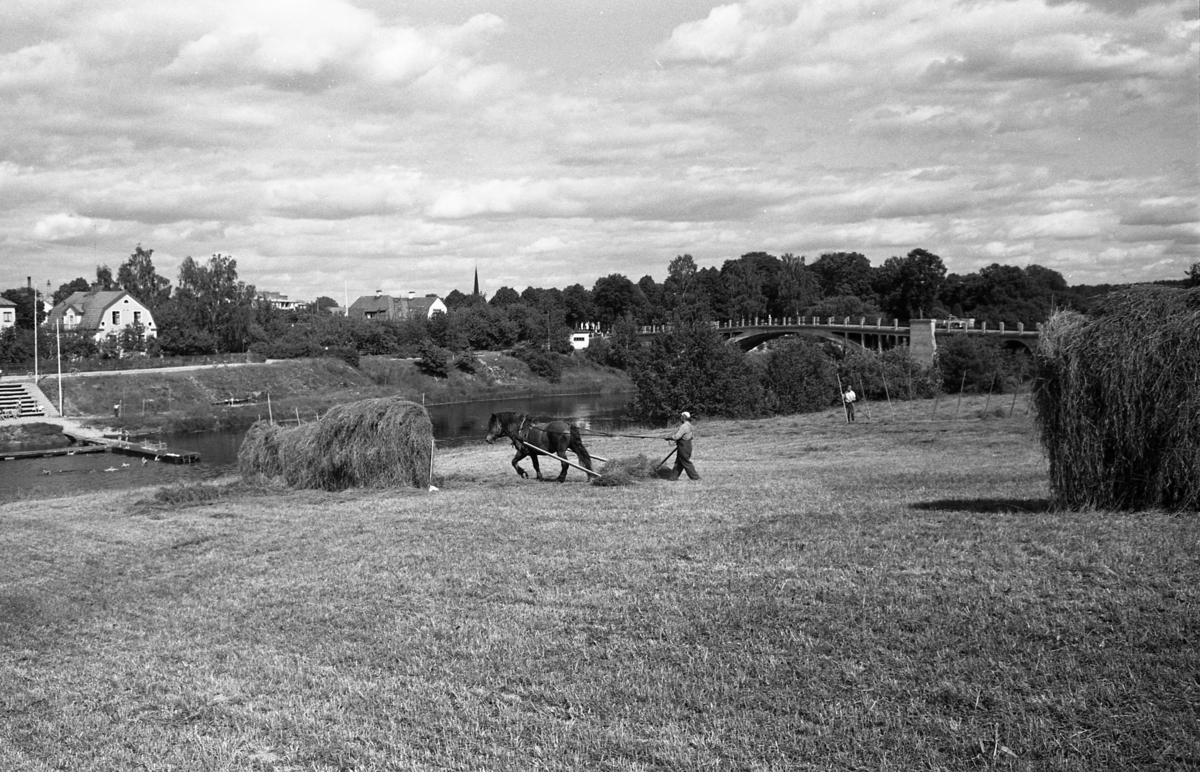 Höskörd på fältet sydväst om Västerbron. En man arbetar tillsammans med en häst. Två hässjor är klara. En man har satt upp störar till nästa höhässja. På andra sidan Arbogaån ses Villagatsbadet.