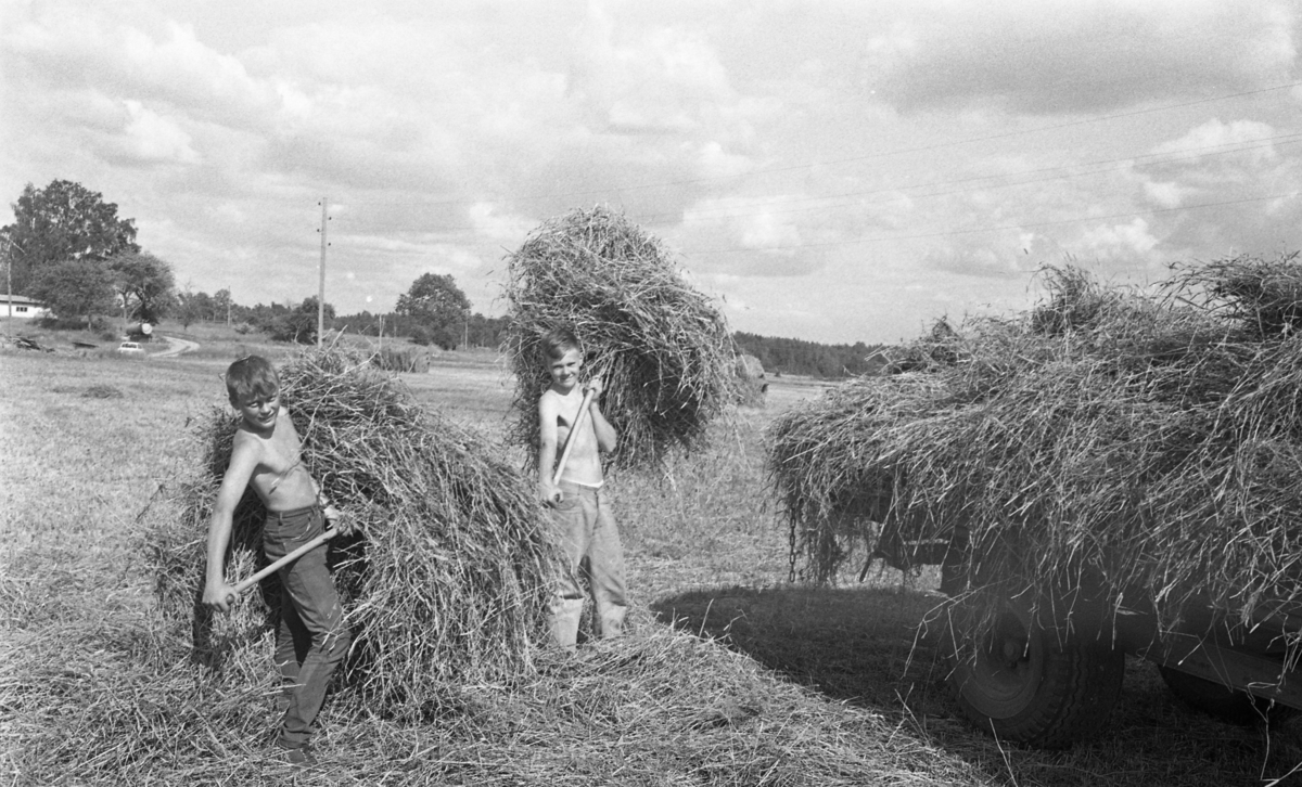 Höskörd. Två pojkar lastar hö på en vagn. Hässjor ses i bakgrunden.