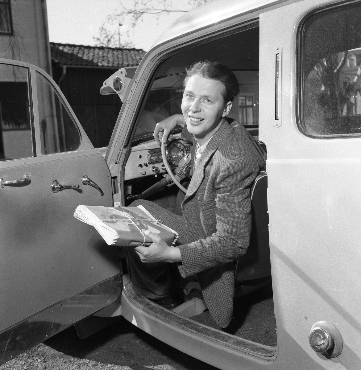 Willy Johansson sitter bakom ratten. Han har en bunt tidningar i handen.