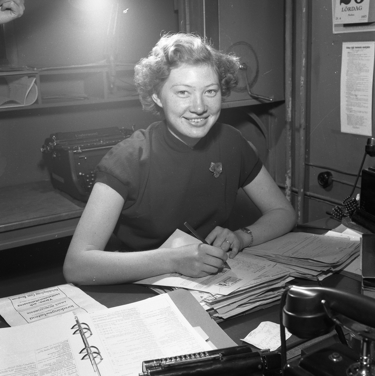 Bakom skrivbordet sitter Ann-Marie Eriksson med en penna i handen. Hon har två pappershögar framför sig. På bordet finns även en pärm, en telefon och en räknemaskin. Bakom hennes rygg, står en skrivmaskin, på en hylla.