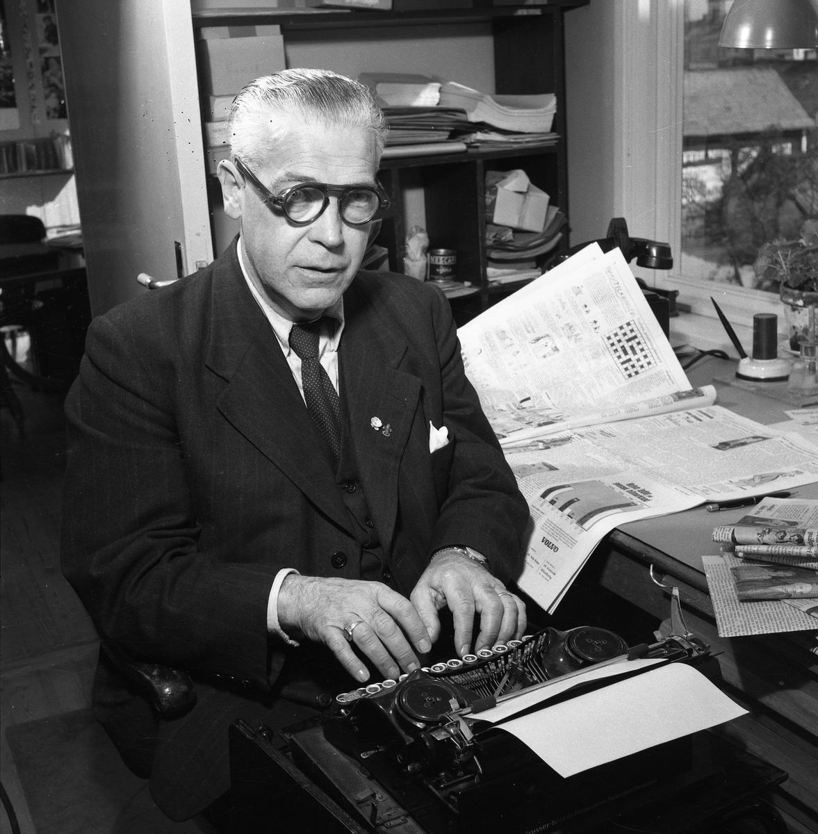 Arboga Tidning, personal och interiör. Redaktör Eitel Noll vid skrivmaskinen. Han har en uppslagen tidning och en telefon på skrivbordet. I bakgrunden syns en hylla med papper och föremål i. Han sitter nära fönstret, hans kontor ligger någon våning upp i byggnaden. Bakom hans rygg är dörren öppen in till nästa kontorsrum.