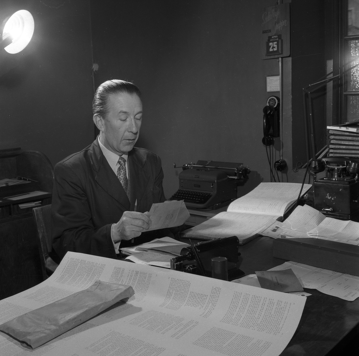 Arboga Tidning, interiör. En man, iklädd kavaj och slips, sitter vid ett skrivbord. Han har mycket papper omkring sig. Nu öppnar han ett kuvert. På bordet står en telefon. En annan telefon (möjligen en interntelefon) hänger på väggen.