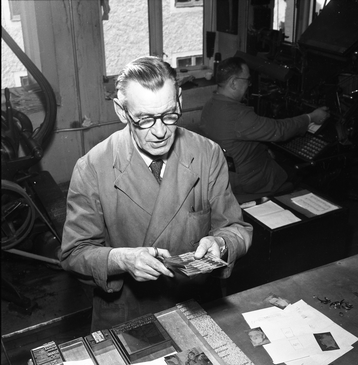 Två män, båda i skyddsrock, arbetar på var sin arbetsplats. Mannen närmast kameran är möjligen sättare. Han har en sax i handen. På bordet, framför honom, ligger några porträttbilder. Mannen i bakgrunden arbetar vid en maskin.