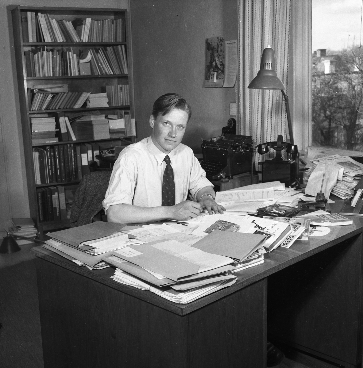 En man sitter vid ett skrivbord med en penna i handen. Möjligen är han journalist. Han har skjorta och slips på sig, kavajen har han hängt över stolsryggen. Skrivbordet är belamrat med papper och trycksaker. Där finns även en telefon, en askkopp och en skrivbordslampa. Skrivbordet står nära fönstret, det syns att mannens kontor ligger någon våning upp i huset.