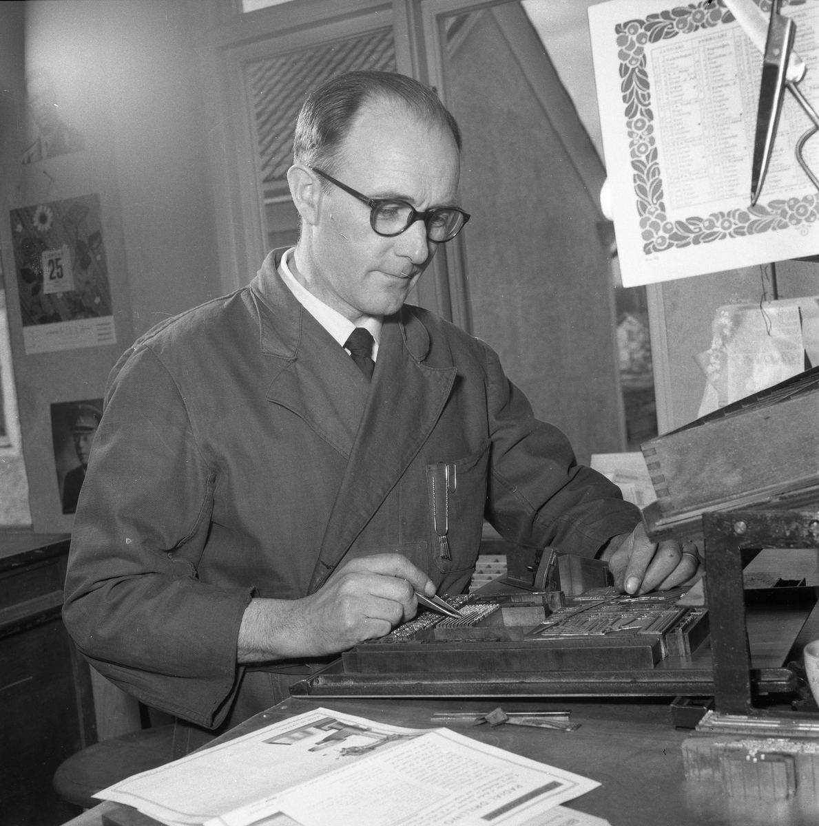 En man arbetar med typer. Skjorta och slips syns under skyddsrocken. Han har ett pincettliknande verktyg i handen. På väggen, i förgrunden, syns en lång sax och en almanacka. På väggen bakom honom skymtar också en almanacka samt ett porträtt på kung Gustav Vl Adolf.