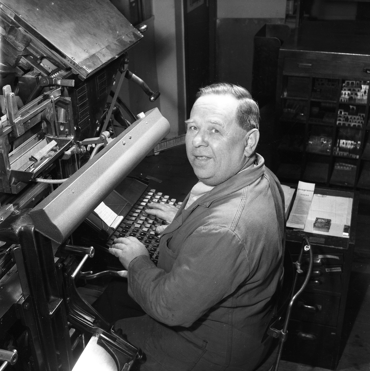 En man, iklädd skyddsrock, arbetar med en maskin i tryckeriet.