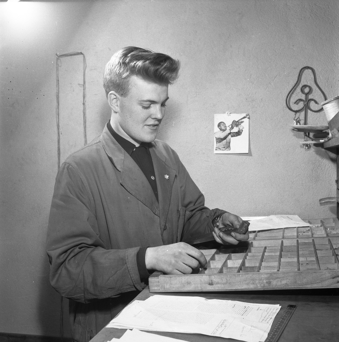 Ung man, iklädd skyddsrock. Han är möjligen typograf. På väggen bakom honom sitter en bild på trumpetspelaren Louis Armstrong.