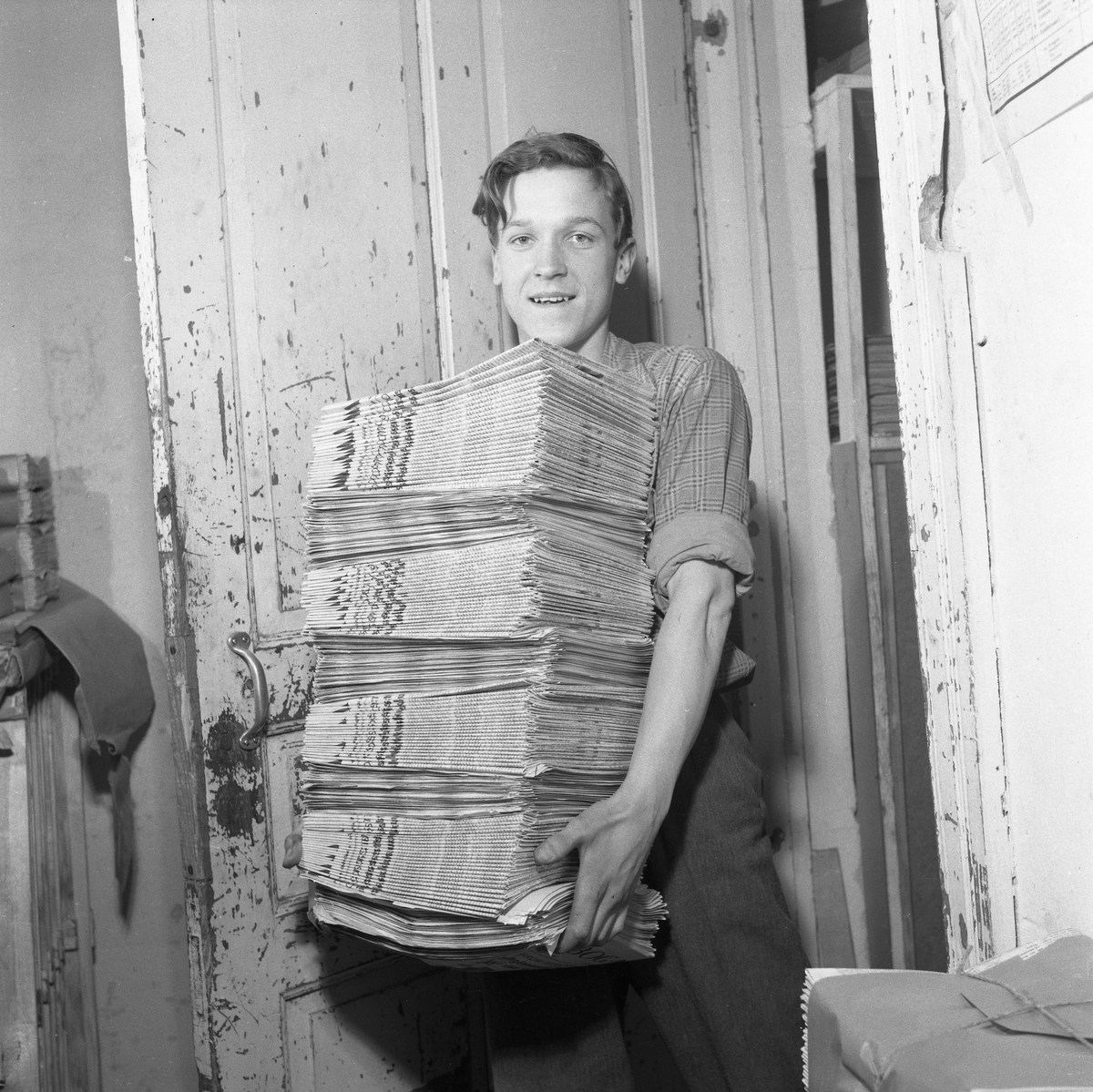 En ung man står, i dörröppningen, med flera tidningsbuntar i famnen.