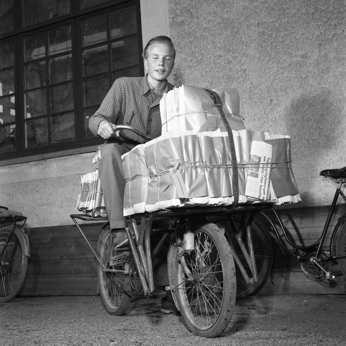 En ung man sitter på en cykel fullastad med tidningar som ska levereras. Tidningsbuntarna hålls på plats av snören och en lång läderrem.