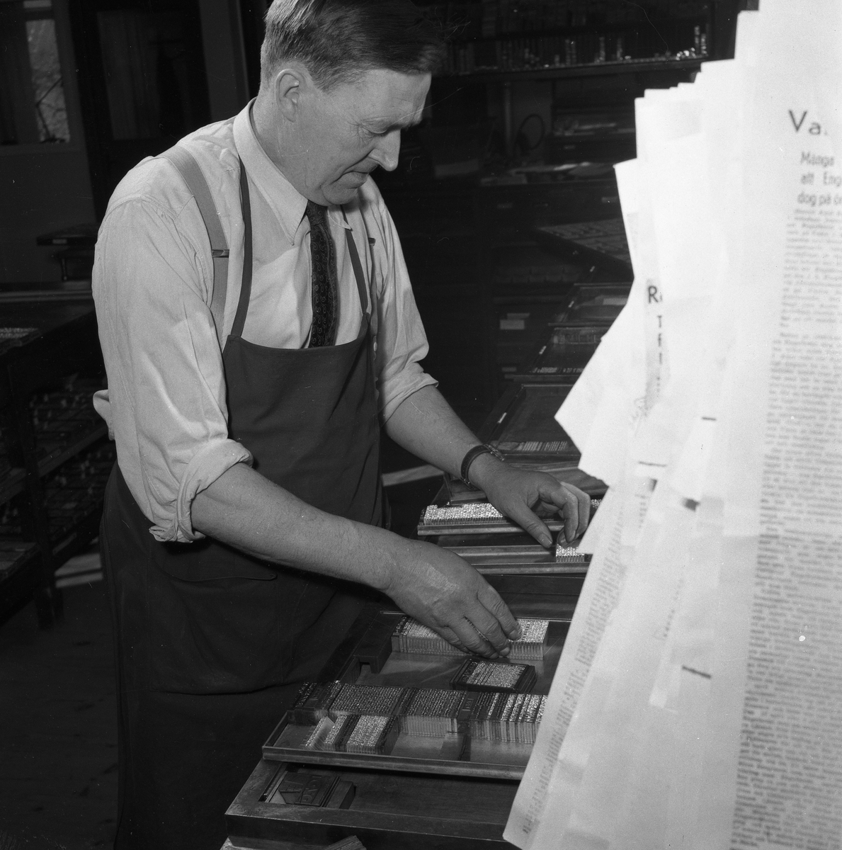 Arboga Tidning, personal och interiör. En man, iklädd skjorta, slips och förkläde, arbetar med typer i tryckeriet.