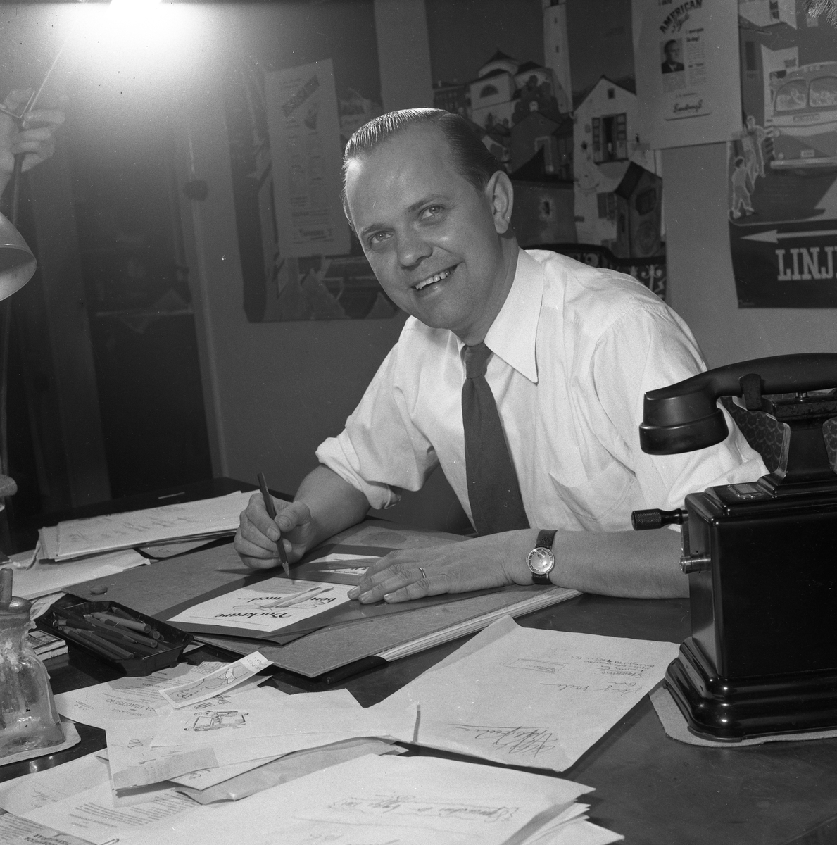 En man sitter vid skrivbordet och skissar. Han har en penna i handen och ett papper framför sig. Han har många papper utspridda på bordet. Där finns även ett pennfat och en telefon. På väggen, bakom mannens rygg, ses flera affischer.