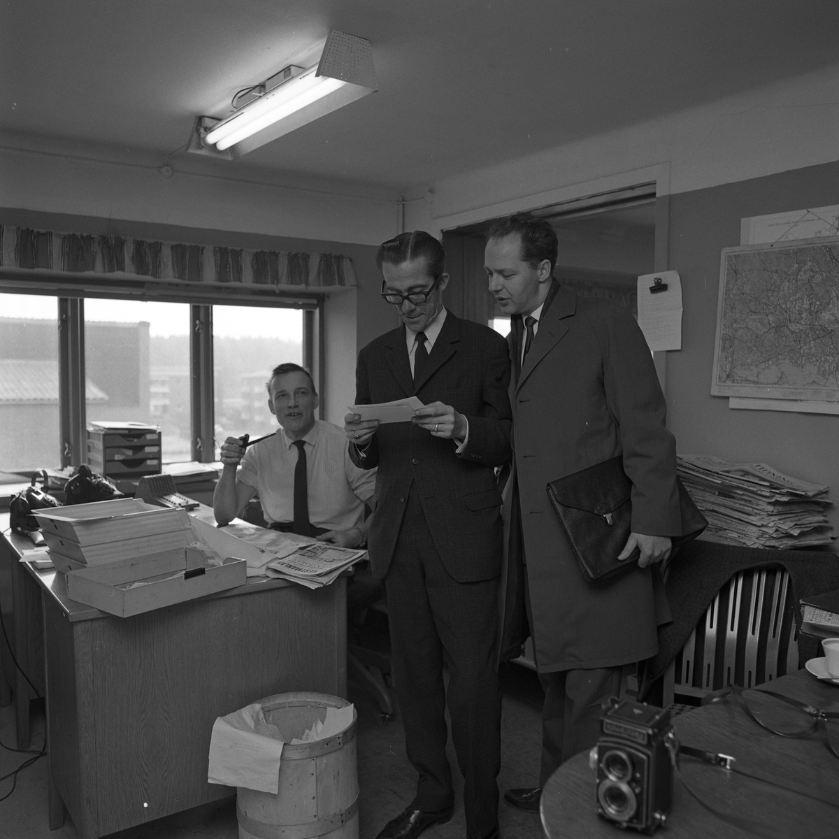 Arboga Tidning, personal och interiör. Tre personer vistas i rummet. Två personer står och tittar på ett papper som den ene mannen håller i. Mannen med papperet är klädd i kostym och slips. Den andre mannen, Willy Johansson, är klädd i överrock och har en portfölj under armen. Mannen vid skrivbordet röker pipa.