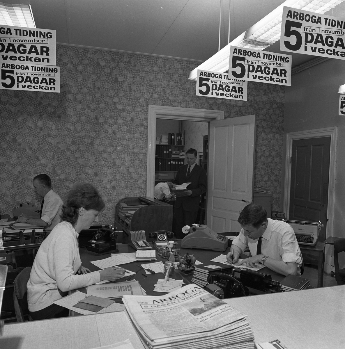 Tre personer, två män och en kvinna, arbetar i samma kontor. De har var sitt skrivbord. I miljön ses flera telefonapparater, en räknemaskin och en skrivmaskin. I förgrunden ligger en bunt tidningar. I taket hänger skyltar som upplyser om att Arboga Tidning ges ut fem dagar i veckan från och med första november.