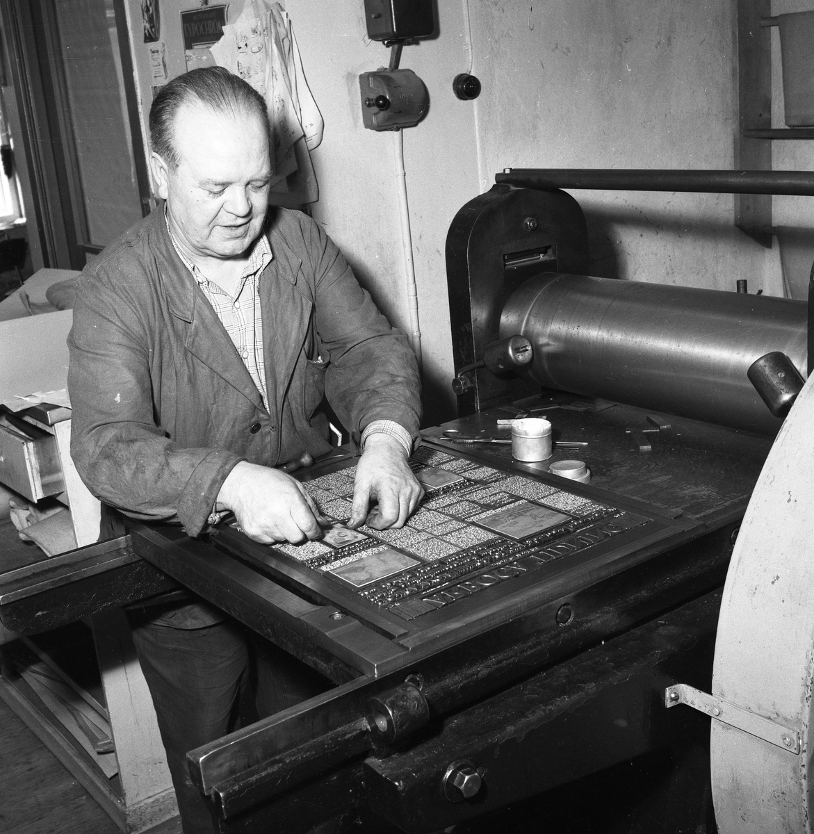 Arboga Tidning, personal och interiör. En man, iklädd skyddsrock, sätter en tidningssida. Han har trycksvärta på fingrarna. På väggen bakom honom finns en strömbrytare.