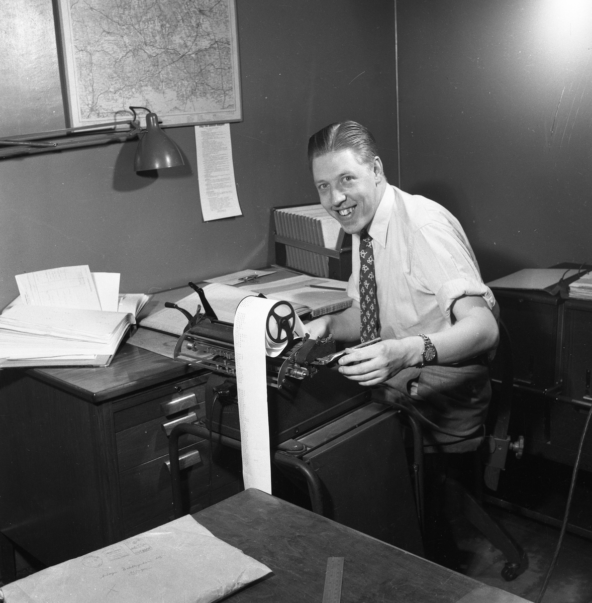 Arboga Tidning, personal och interiör. En man, iklädd skjorta och slips, arbetar vid en räknemaskin. Kontorsstolen är försedd med hjul. På skrivbordet ligger en uppslagen pärm. På väggen hänger en karta.