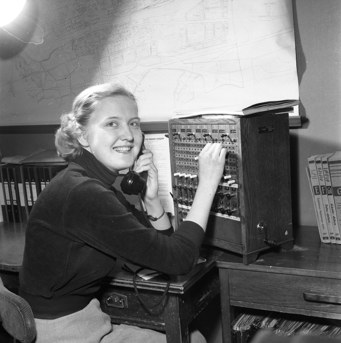 Arboga Tidning, personal och interiör. En kvinna sitter i telefonväxeln. Hon har en telefonlur i handen och kopplar samtalet med den andra. Till vänster om henne står en mängd pärmar. På väggen, framför henne, hänger en stadskarta.