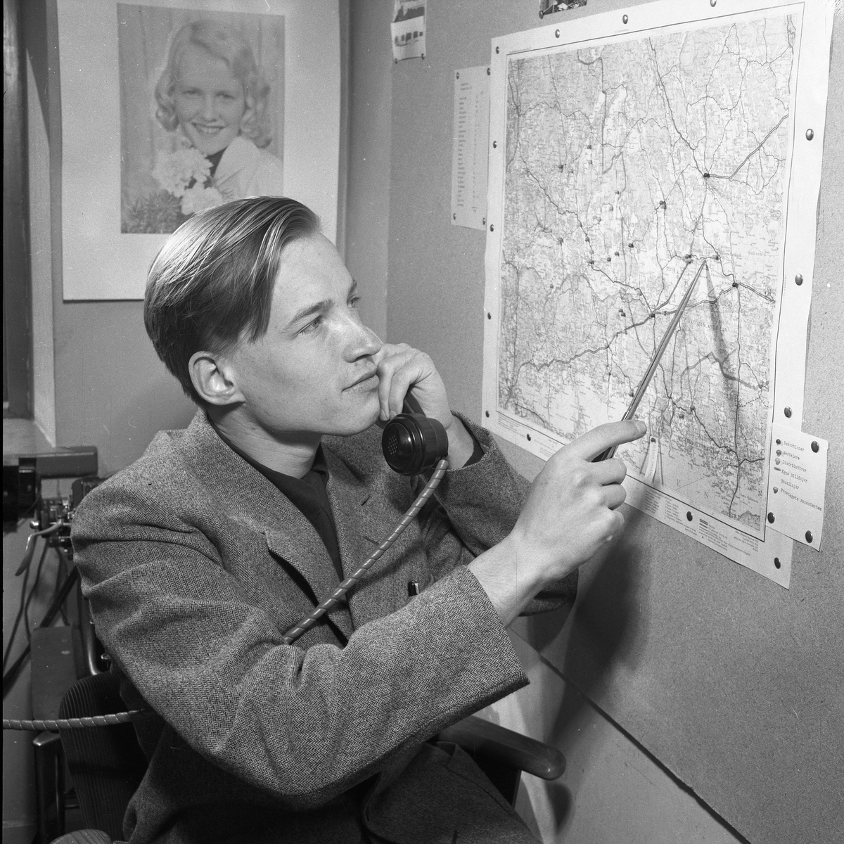 Arboga Tidning, personal och interiör. En ung man, iklädd kavaj, sitter på kontoret. Han har en telefonlur i ena handen och en pekpinne i den andra. Han pekar på en karta som är uppsatt på väggen. På väggen, bakom hans rygg, sitter en bild på en ung flicka.