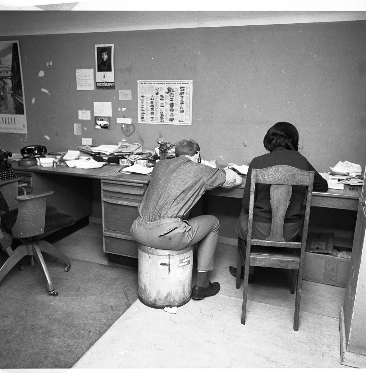 Arboga Tidning, personal och interiör. Två journalister arbetar vid samma skrivbord. De har ryggen mot fotografen. Mannen sitter på en papperskorg och kvinnan på en trästol. Till vänster om dem finns en obemannad arbetsplats med en telefon och en arbetsstol på hjul. En skrivmaskin skymtar. På väggen sitter bland annat en affisch med olika svampar.