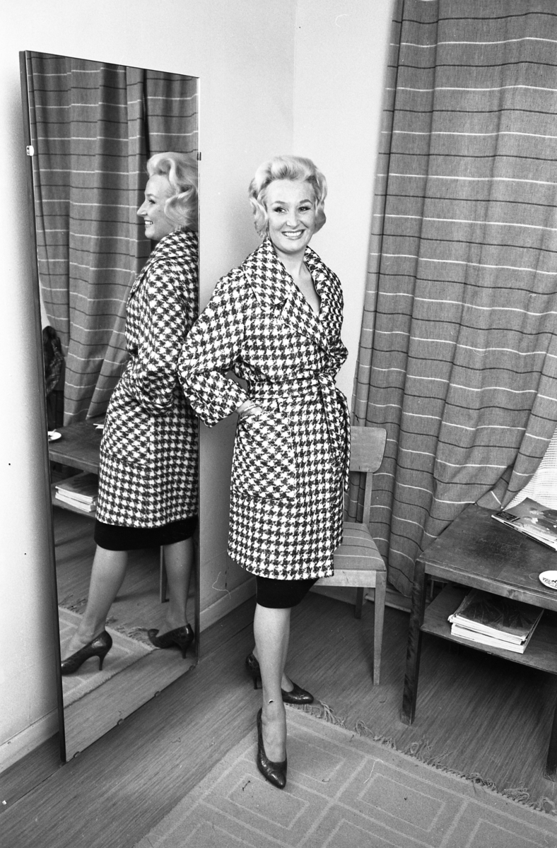 Kvinna i hundtandsmönstrad kappa. Öhrman och Melander har modevisning på Folkan/Medborgarhuset. Mannekänger är personal och medlemmar i Arboga Lottakår.