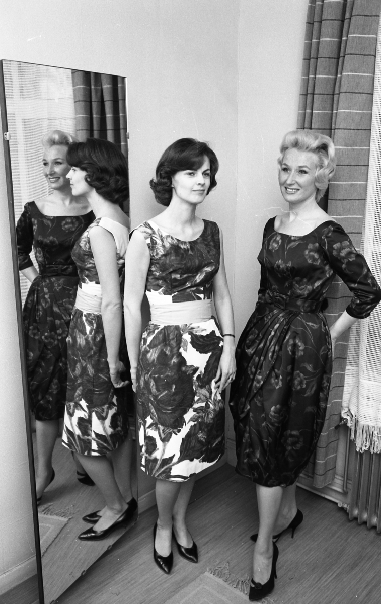 Mannekänger vid spegel. Öhrman och Melander har modevisning på Folkan/Medborgarhuset. Företagets personal och medlemmar i Arboga Lottakår visar kläderna. Kvinnan till vänster är Marianne Rosenkvist.