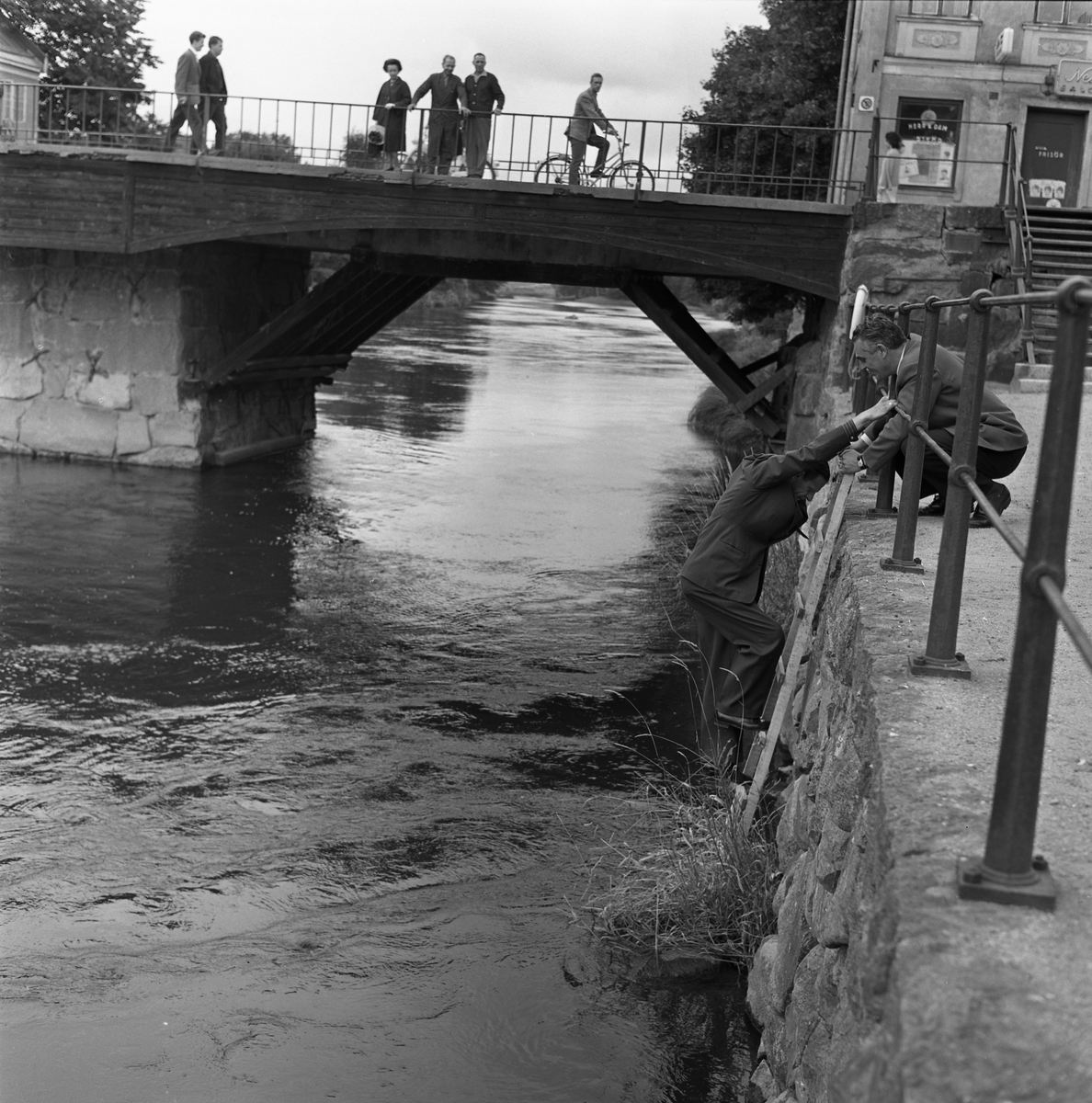 En katt har ramlat i ån! Polisman Ivan Pettersson klättrar ner på stegen och polisman Ragnar Hedin håller i. Människor har stannat på Kapellbron för att följa händelseutvecklingen.