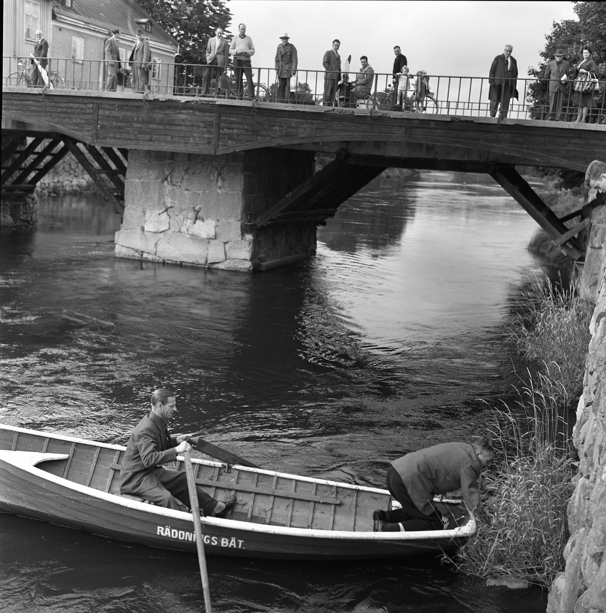 Polisen räddar katten Måns som trillat i ån. Ivan Pettersson sköter årorna i räddningsbåten medan Ragnar Hedin försöker få tag på Måns. En stor publik har samlats på Kapellbron.