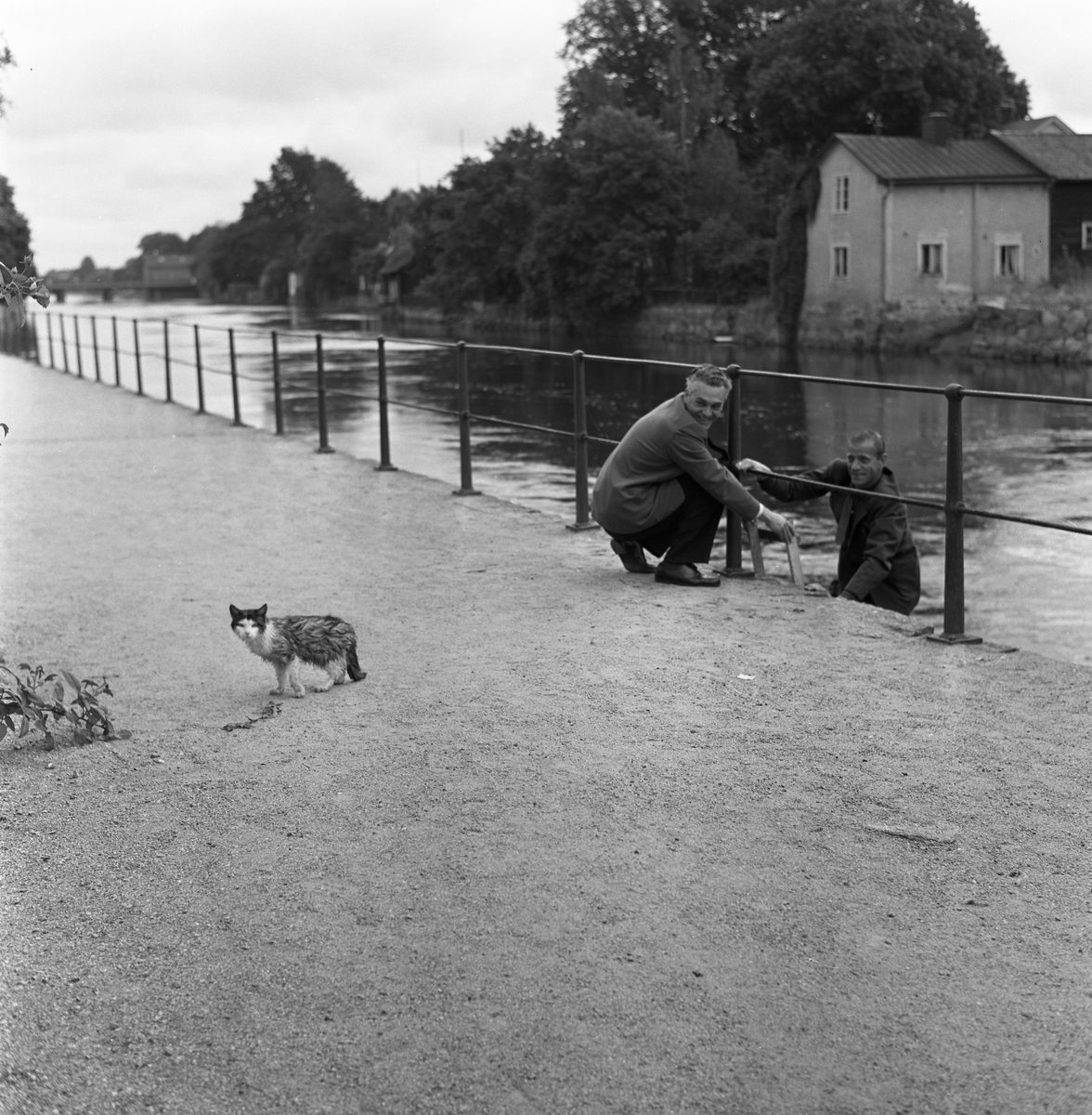 Uppe ur ån! Katten Måns har räddats av polismännen Ragnar Hedin (sittande) och Ivan Pettersson, på stegen.