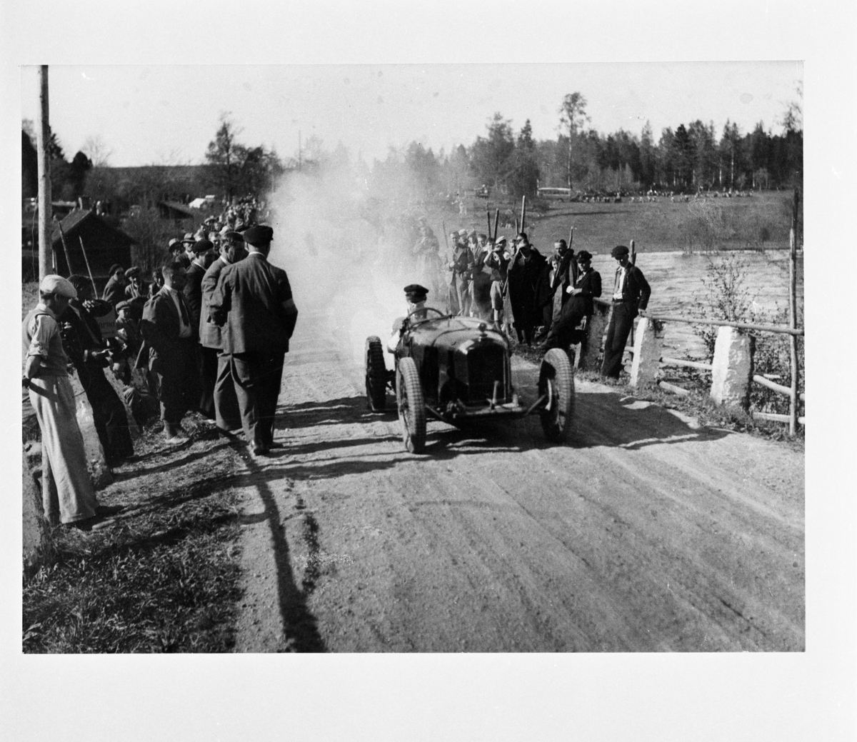 Reproduktion, Röfors. En man kör en bil/traktor med stort rökmoln bakom. Publiken står i vägkanten.