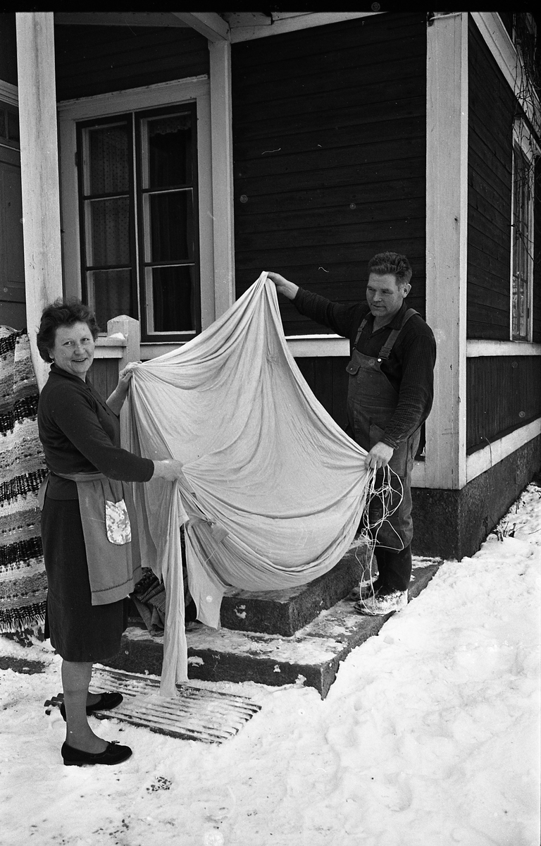 En luftballong har trillat ner hos Signe och Olle Andersson, Tåby, Medåker. Makarna håller i ballongtyget. De står vid trappan in till huset. Det är snö ute. En trasmatta hänger på vädring över trappräcket. Signe har klänning och ett midjekort förkläde. Olle har snickarbyxor på sig.