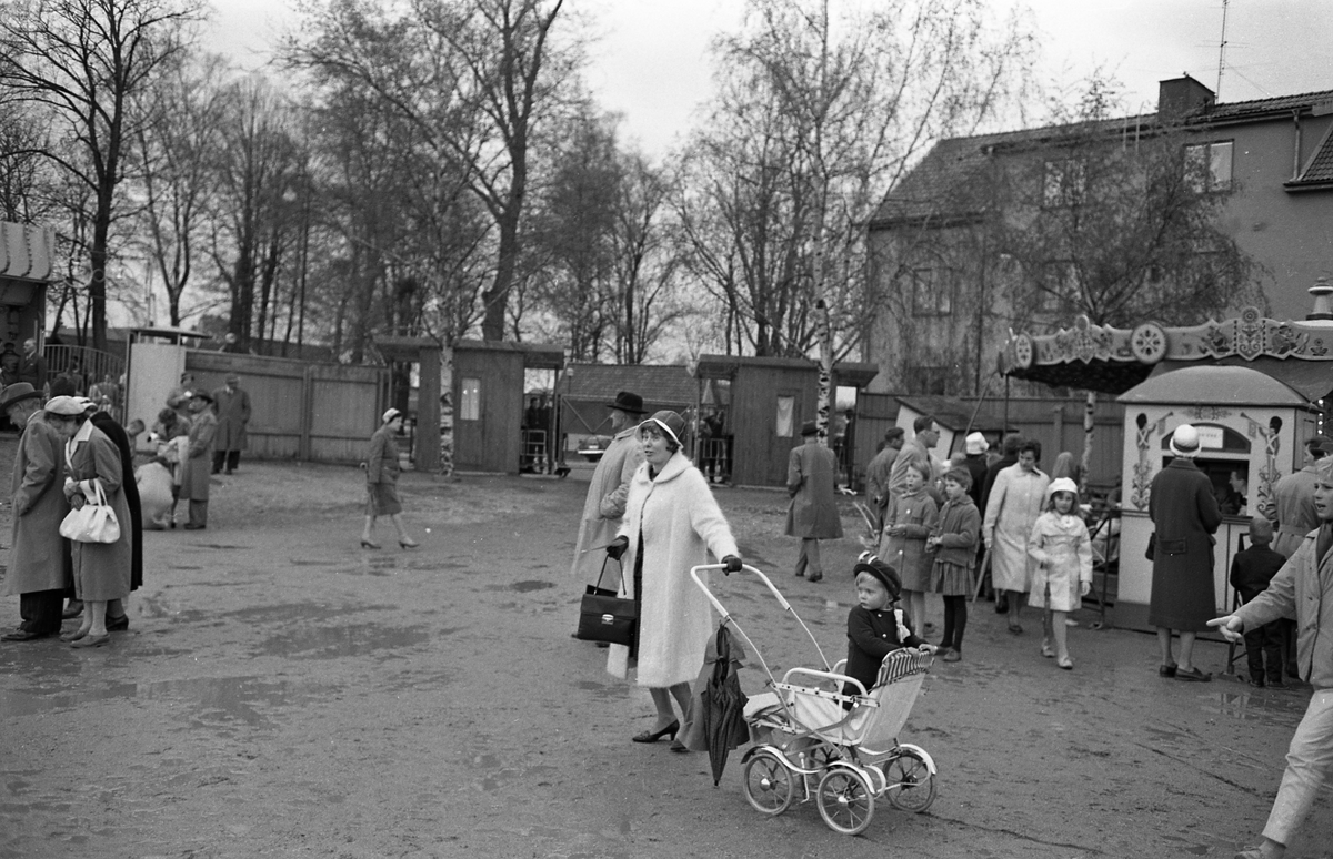 Barnens Dag firas på Sturevallen med karuseller och lottstånd. Människor i alla åldrar har kommit till festplatsen trots att det har regnat. I förgrunden ses en kvinna med ett barn i vagn. Hon har paraply med sig. I bakgrunden ses träden i Olof Ahllöfs park.