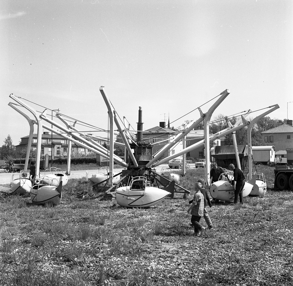 Barnens Dag. Två män arbetar med en karusellkorg. Två små pojkar tittar på. Karusellen verkar tillfälligt placerad. Platsen kan möjligtvis vara vid Vallgatan. I bakgrunden skymtar tornet på Heliga Trefaldighets Kyrka.